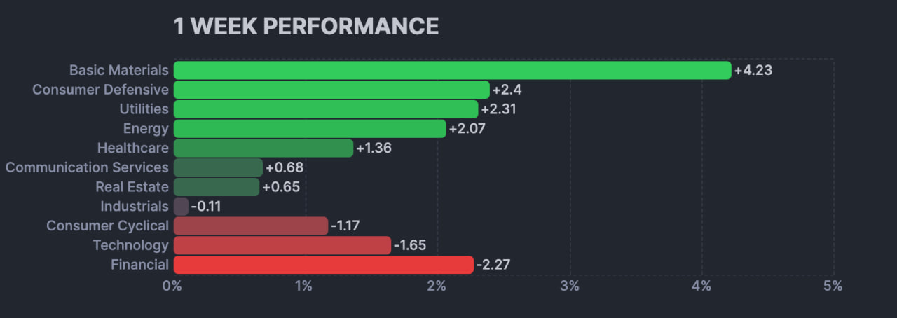 지수가 부진해서 전체가 하락했나라는 느낌이지만, 실제로는 빅텍 위주로 하락. 의외로 상승한 섹터들이 많습니다. 미국-이란 분쟁을 미리 예견한 듯, 원자재 섹터가 크게 상승했고, 방어주들도 상승했습니다.