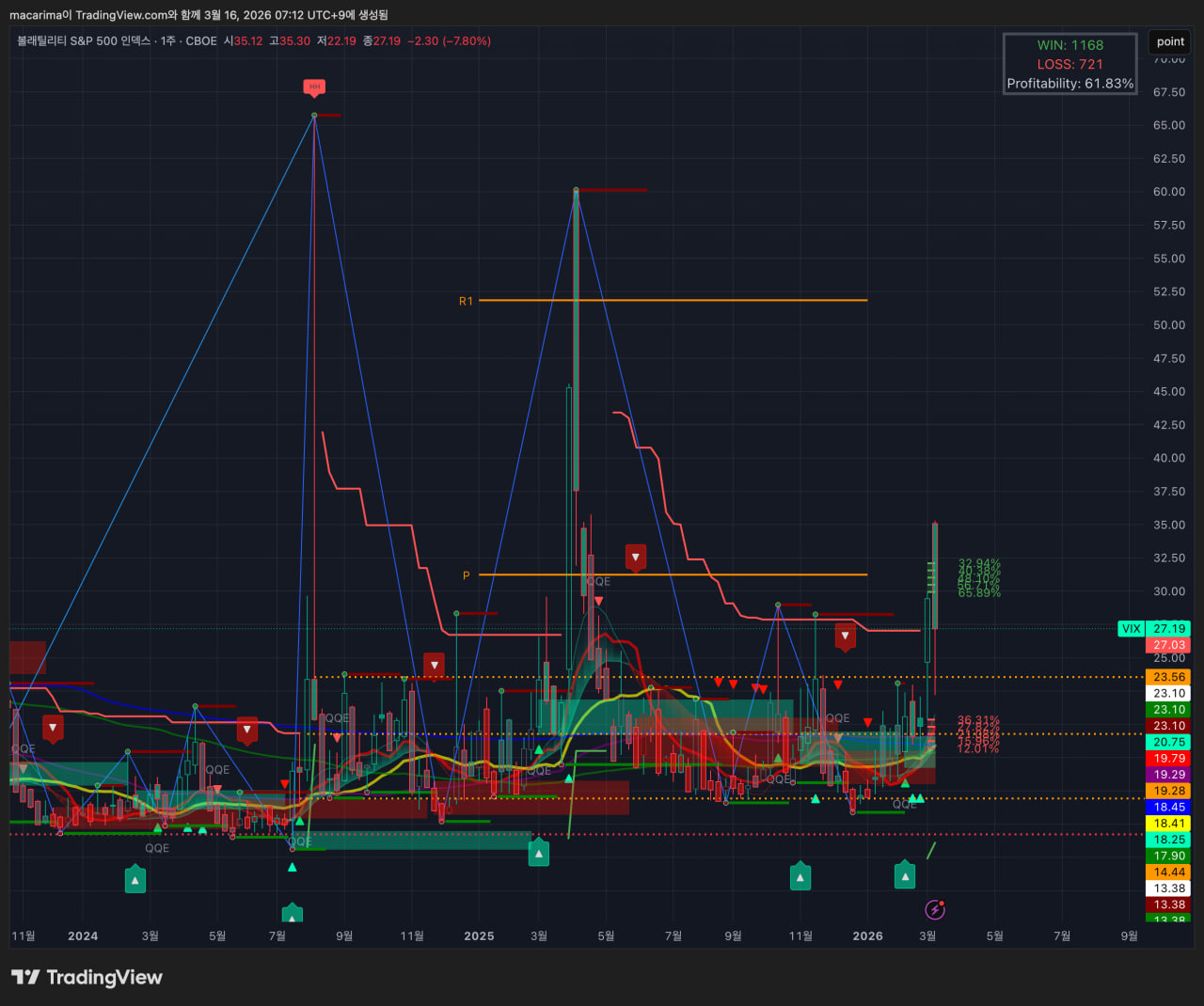 VIX는 크게 돌파하여 35를 잠시 넘었다가 27.19까지 밀려났습니다. 다만 매크로 상황과 다음주 금요일에 있을 대규모 만기(세 마녀의 날)을 고려했을 때, 추가적인 상승이나 흔들 수 있어 보이는 점을 주의해야 할 것 같습니다.