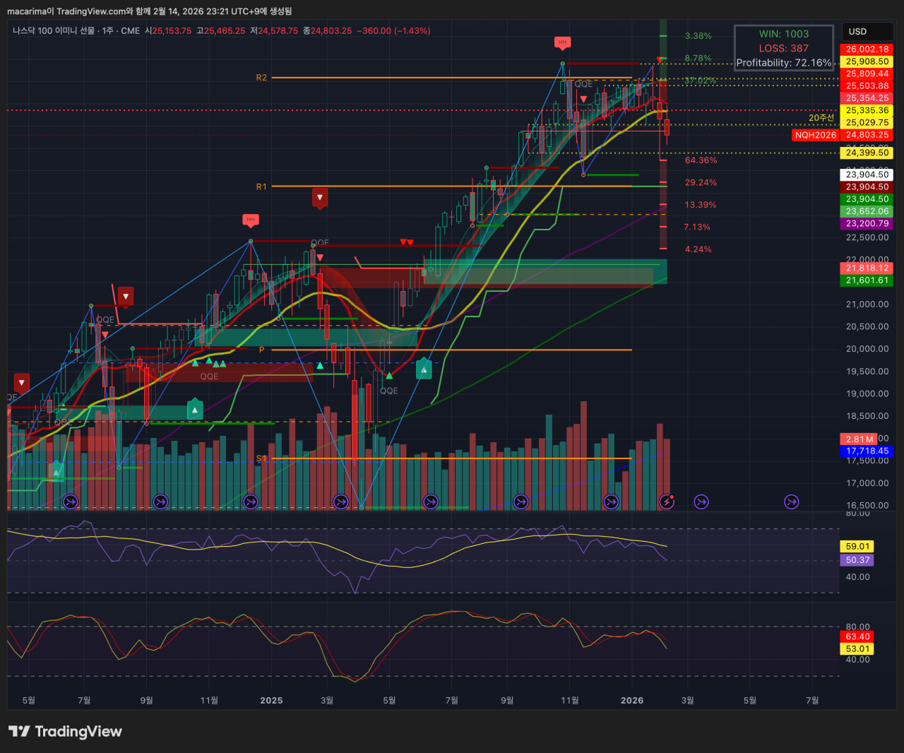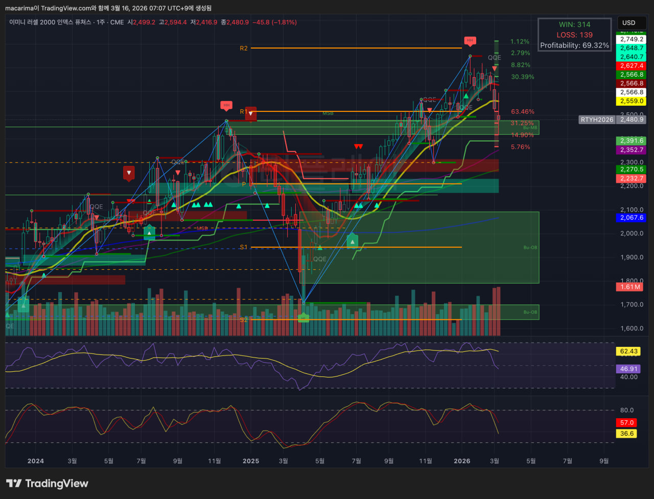 러셀 2k 역시 하락하여 2025년 고점에 형성되어 있는 지지선 밑으로 밀렸다가 회복하며 마감했습니다.