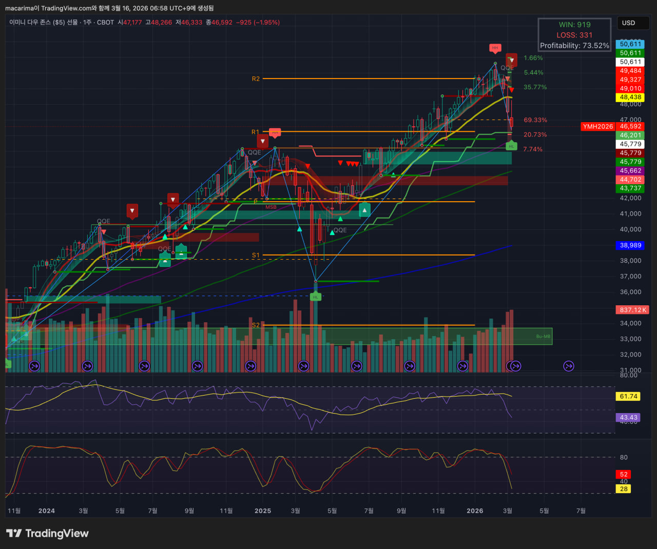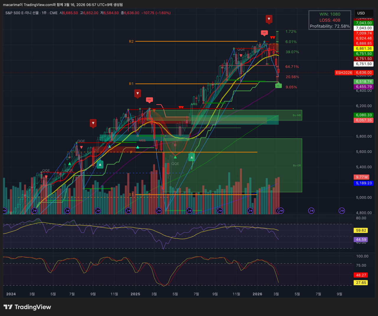 매크로적으로는 지난주에 이어 미국-이란 전쟁이 심화되며 확전 양상을 보였고, 이란의 호르무즈 해협 봉쇄 선언이 현실화되면서 물류 비용의 증가로 인한 인플레 상승 우려로 일부 다음주 호재가 있는 섹터와 에너지 섹터를 제외한 전반적인 섹터가 하락을 보였습니다. 금리 인하 가능성 역시, 전쟁 여파로 인해 더욱더 줄어드는 ...