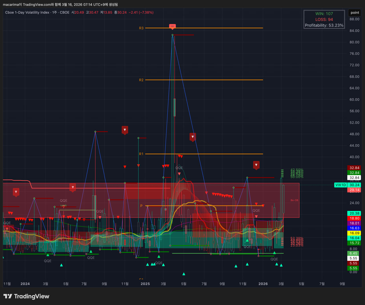 VIX1D 역시 강하게 상승하며 마무리. 지난주 고점에 근접한 상황입니다. VIX와 VIX1D의 추세를 보면 다음주 월요일 장이 우려스럽습니다. (지난주와 같은 상황이네요)