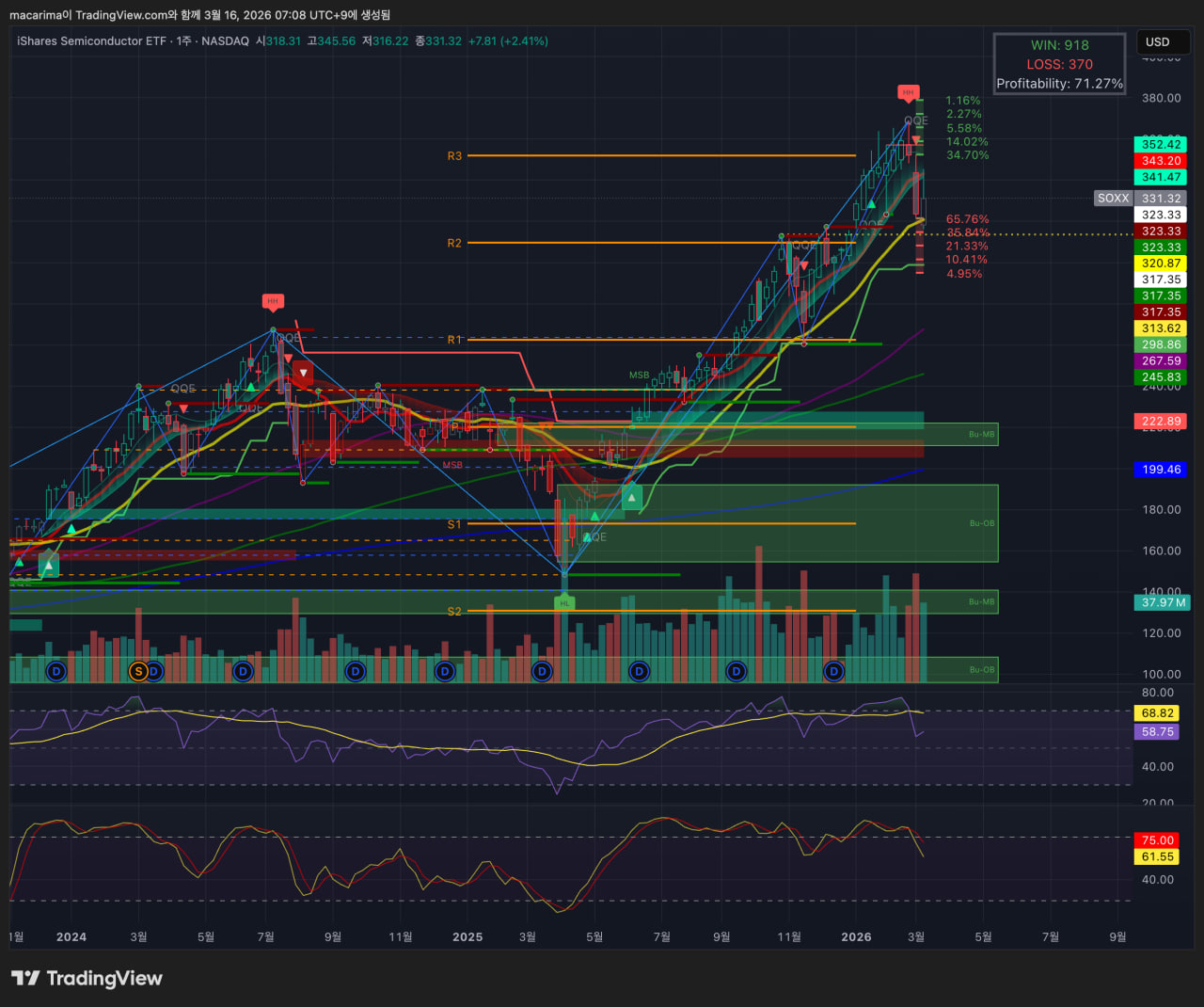 반도체 섹터는 20주선을 지지하며 3.4% 상승 마감했습니다. 이번주 나스닥이 그나마 버틸 수 있는 이유였습니다.