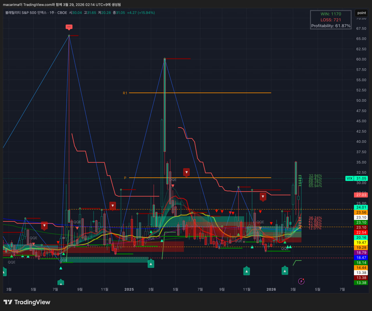 VIX는 31까지 상승하여, 변동성 확대를 보였습니다. 추가적인 상승이 가능한 모습입니다.