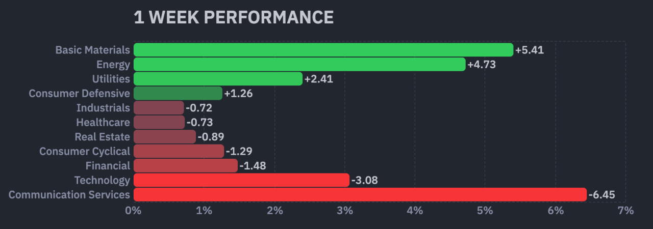 반도체 섹터는 지난주의 반등을 모두 반납하고 하락하여 20주선까지 하락했습니다. 이전의 양봉을 완전히 감싸버린 형태의 음봉이 발생했습니다.