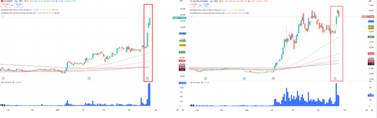 바르질라의 데이터 센터향 엔진 납품이 한국에도 적용 가능하다는 내러티브가 HD현대중공업의 6천억 규모의 엔진발전기 공급으로 인해 실체를 확인 + 조선주 만인의 루저였던 삼성중공업 마저 부유식 데이터 센터라는 25년도의 내러티브를 다시 소환하면서 장대양봉.
