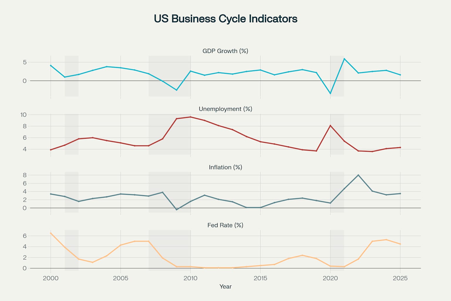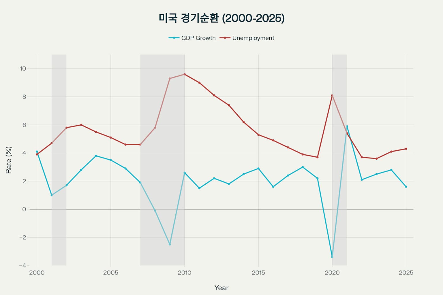 미국 경기순환: GDP 성장률과 실업률 변화 (2000-2025)