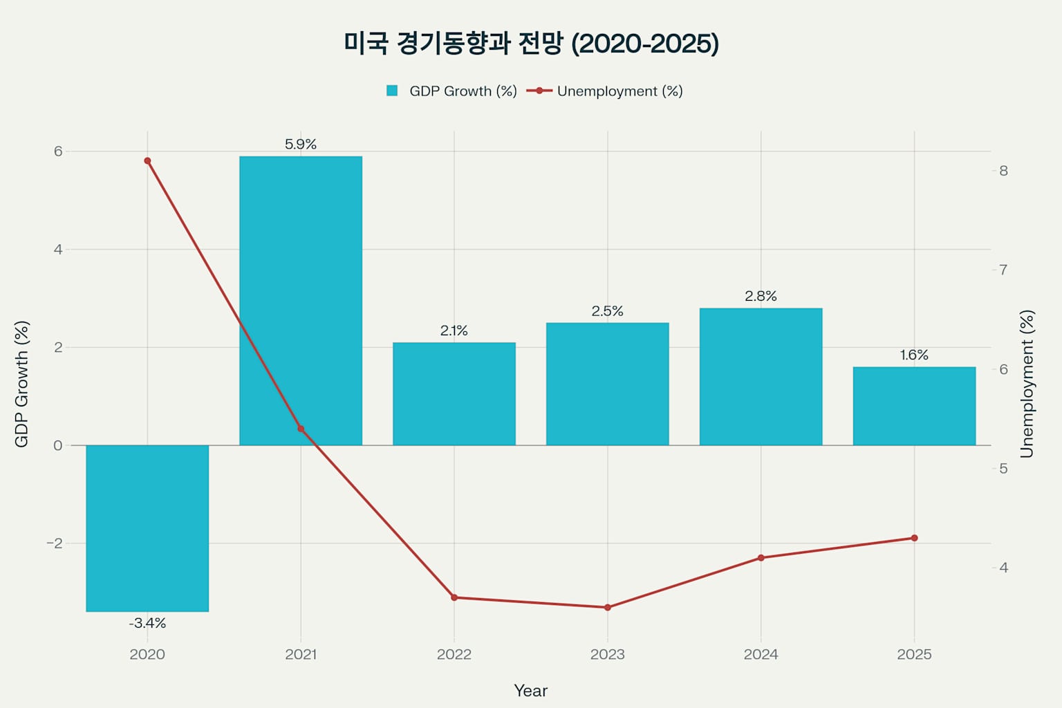 2020년 코로나19 팬데믹은 미국 경제에 전례없는 충격을 가했습니다915. GDP 성장률이 -3.4%로 급락하고 실업률이 8.1%까지 치솟았으나, 적극적인 재정·통화정책으로 2021년 5.9%의 높은 성장률을 기록하며 빠른 회복세를 보였습니다922.