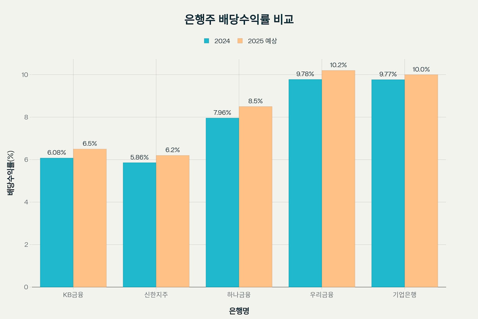 특히 배당 수익률 측면에서 우리금융지주는 2025년 10.2%, 기업은행은 10.0%의 높은 배당수익률이 예상됩니다56. KB금융, 신한지주, 하나금융지주도 각각 6.5%, 6.2%, 8.5%의 배당수익률을 기록할 전망입니다5.