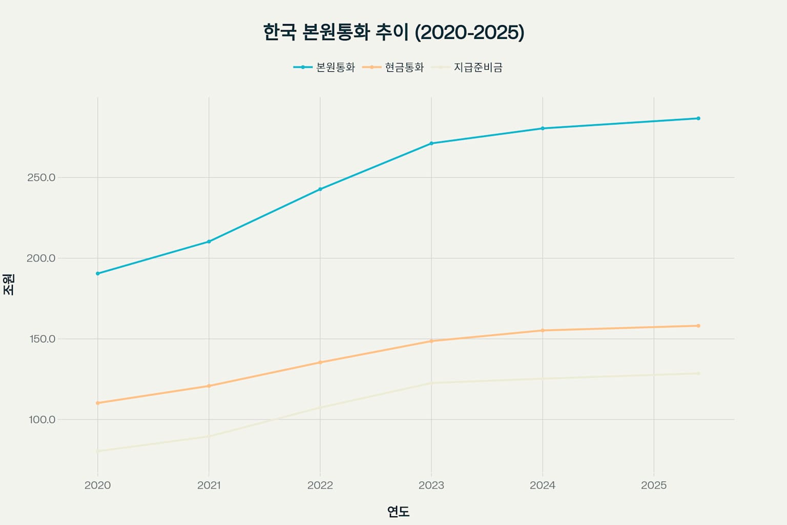 한국의 본원통화는 2020년 190.5조원에서 2025년 4월 286.7조원으로 지속적 증가세를 보임