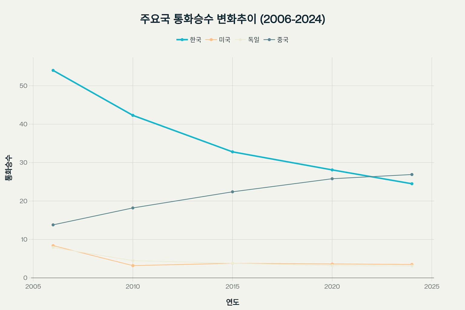 주목할 점은 한국의 통화승수가 지속적으로 하락하고 있다는 것이다15. 2006년 54.0에서 2024년 24.5로 약 절반 수준으로 감소했으며, 이는 같은 기간 미국과 독일의 하락폭(약 4.8포인트)에 비해 5배 이상 빠른 속도이다15. 이러한 현상은 금융시장 발달, 현금 보유 성향 변화, 디지털 결제 확산 등 구조적 요인들이 복합적으로 작용한 결과로 분석된다614.