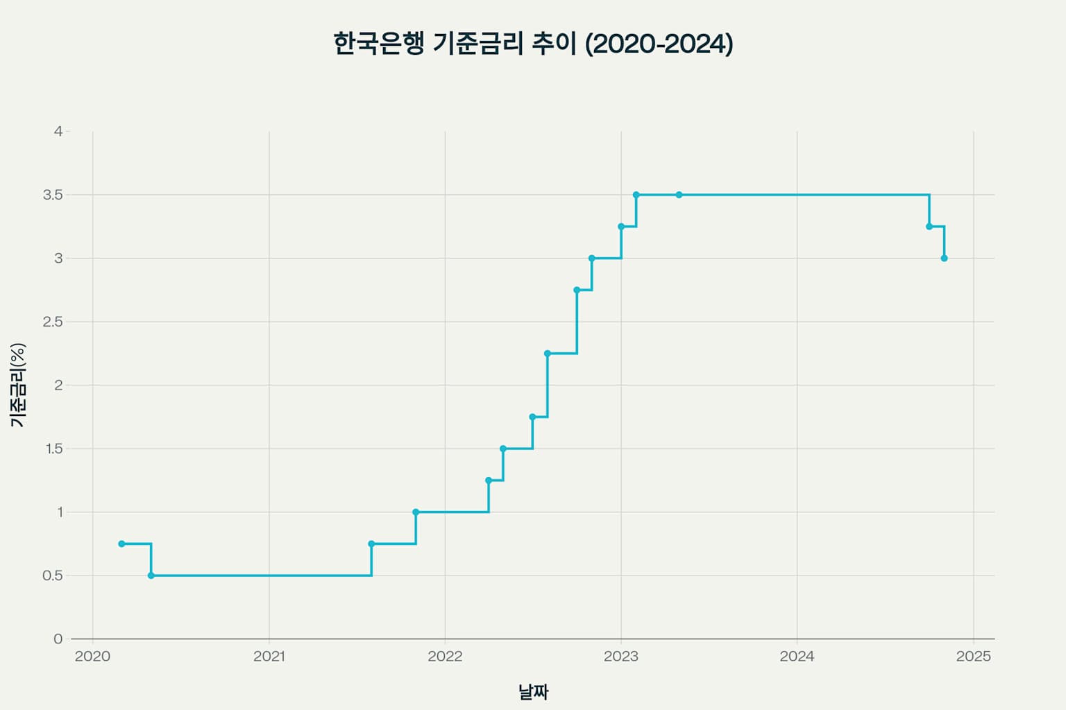 한국은행 기준금리는 코로나19 대응으로 0.5%까지 인하 후 2022년 인플레이션 대응으로 3.5%까지 인상, 최근 성장 둔화로 다시 인하