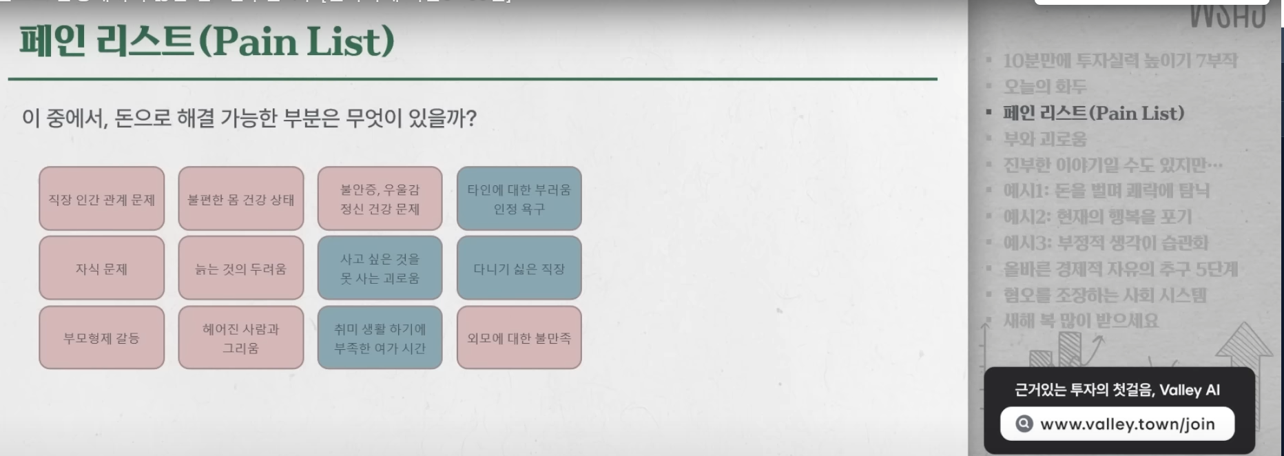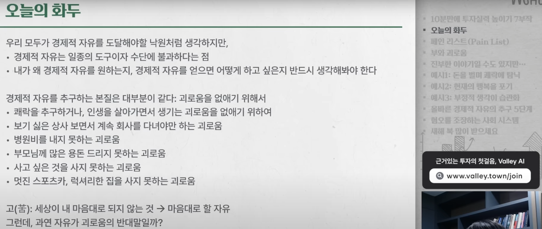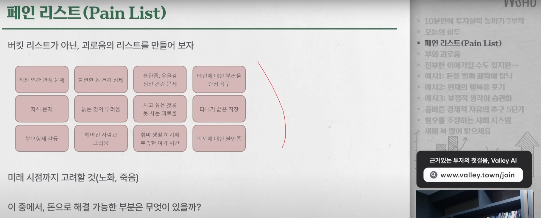2025.01.30작성버킷리스트가 아닌 괴로움 리스트를 만들어보자.나만의 페인 리스트??직장에서의 진취적인 성공 및 전문분야에 대한 전문가 압박?연봉?투자공부에 대한 방해물들??건강문제?흠 돈으로 해결이 가능한 문제점은 뭐가 있을까회원가입만 해도이 글을 무료로 읽을 수 있어요.회원가입이미 계정이 있으신가요?로그인하기