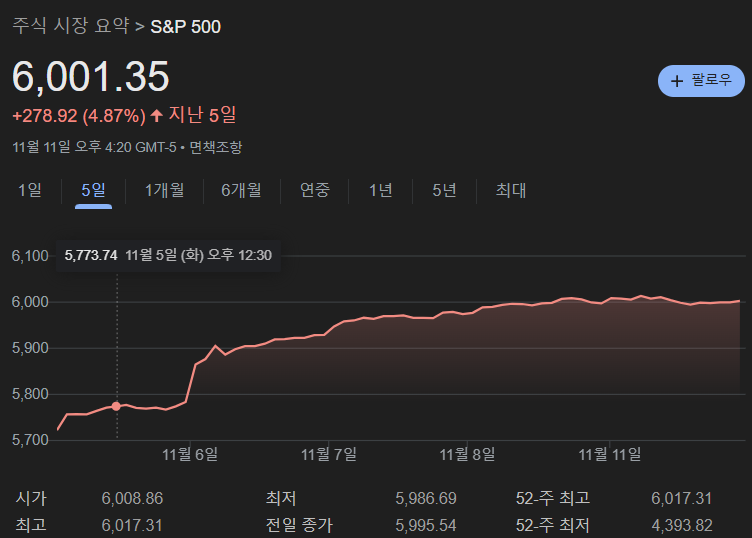 대선 직후 어마어마한 유동성이 풀리면서 때이른 산타 랠리를 맞은 것처럼 모든 시장이 단번에 튀었습니다. 그런데 하루이틀이 지나면서 채권, 금은 가격에 변동이 오는 와중에 나스닥 지수와 S&P는 꽤 굳건하게 버티고 있습니다.