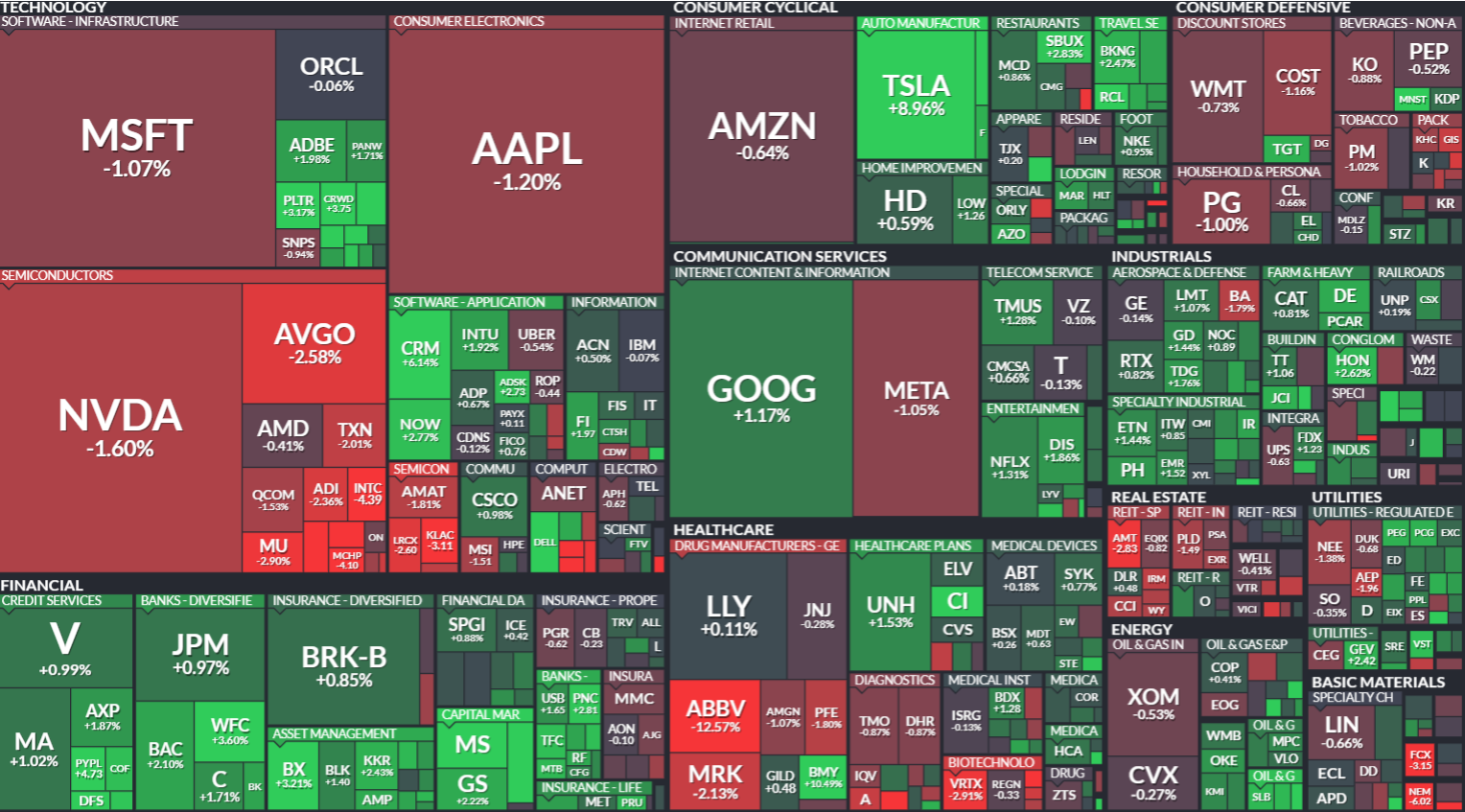 구글, 테슬라를 제외하고 모든 M7이 대선 직후 빵, 터진 주가를 조정받고 있습니다(마소 제외). 다른 섹터를 살펴봐도 빨간색, 초록색이 알알이 박혀있지요.