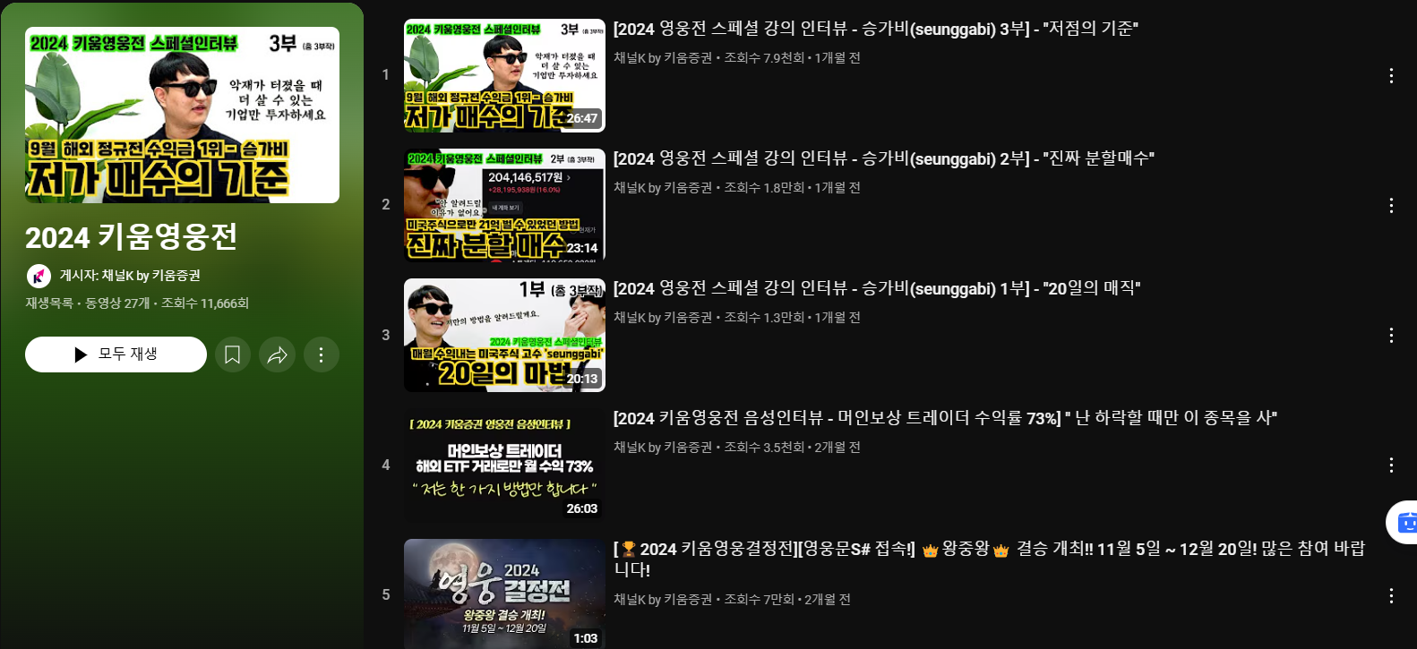 제가 키움증권을 좋아하지 않는 이유기도 합니다. 첫 번째 증권앱으로 키움증권을 골랐는데도. 키움증권은 노골적으로 국장/미장에서 단타를 "영웅전"이란 명목으로 단타를 유도합니다. 영웅전은 반드시 월간으로 치뤄지는데, 높은 월간 수익률을 위해 급등주에 집중해서 단타하는 전략이 가장 유효하고, 실제로 그렇게 생존한 유저가 상위 랭커에 위치합니다.