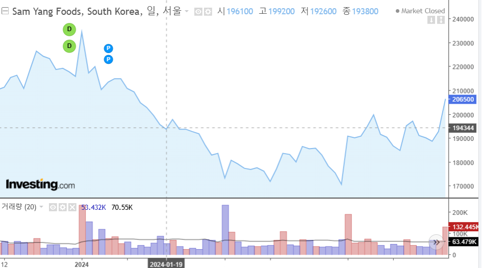 당시 매수근거. 자주 보던 주식 유튜버가 추천했습니다. 작년 초, 국장에 이런저런 종목을 기웃거리던 차에 "해외수출이 좋아? 불닭이 잘 팔려? 오케이, 매수"했습니다. 그밖에 기업 조사는 전혀 하지 않았지요. 비중도, 보유기간도, 목표 수익률도 전혀 정해둔 게 없었습니다. 하지만 당시 비중이 매우 강했다는 건 기억합니다. 그래서 쫄렸거든요.