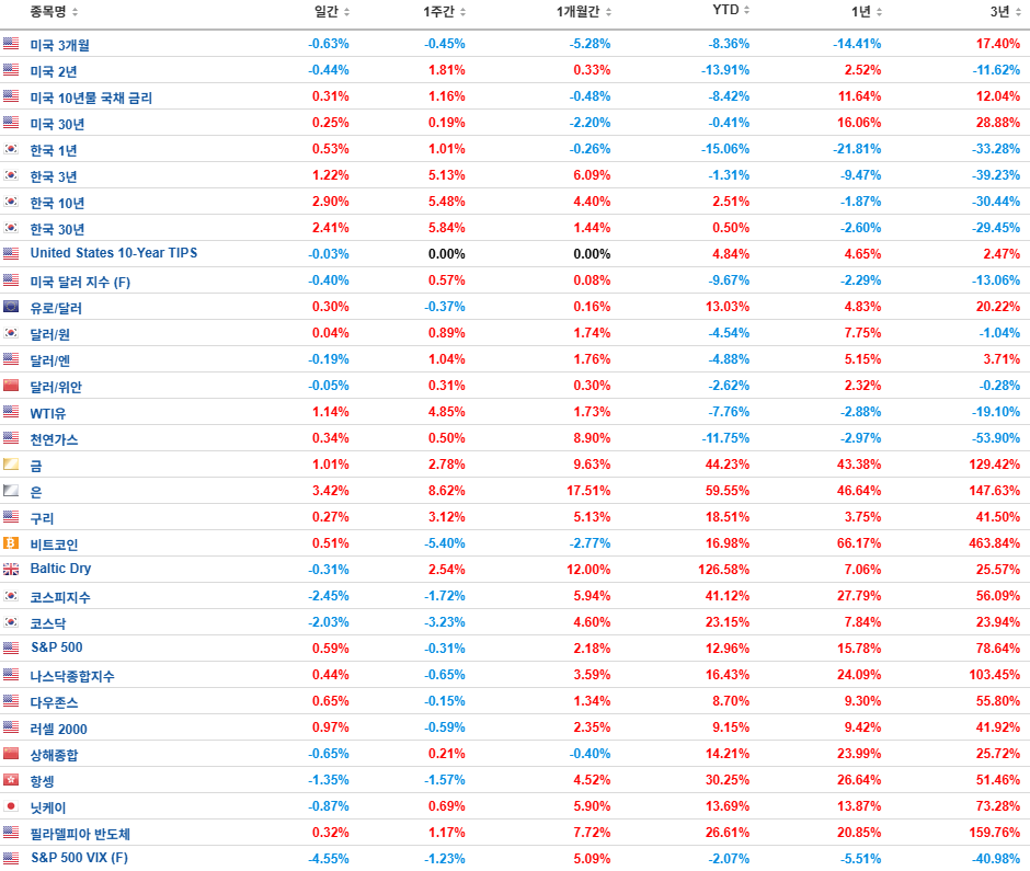 계속 하락하던 달러인덱스는 뜨거운 미국경제 지표 덕분에 상승(0.57%)했다. 시장은 여전히 달러의 추세적 약세가 진행될 것으로 예상하지만 이번주는 반등했다. 유로, 엔, 위안, 원화 거의 모든 통화가 달러 대비 가치가 하락했다. 한국은 놀랍게도 1,410원으로 이번주를 끝냈다.