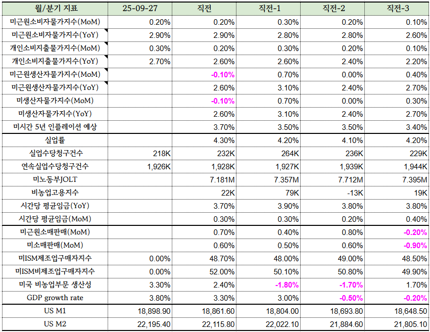 3개월 단기 금리를 제외하고 중장기 금리 모두 상승했다. 놀라운 2분기 GDP와 실업수당청구건수의 감소가 보여주는 미국경제의 열기 때문인 듯 하다. 인플레이션은 여전히 높았지만 시장 예상치와 부합했다는 내러티브로 상승장을 만들어 냈다. 이제 10월 3일의 실업률 결과가 시장의 방향성을 결정할 것이다. 하지만 미정부 셧다운이 확정되면 실업률 데이터를 보지 못할 수도 있다.