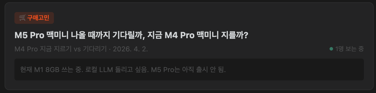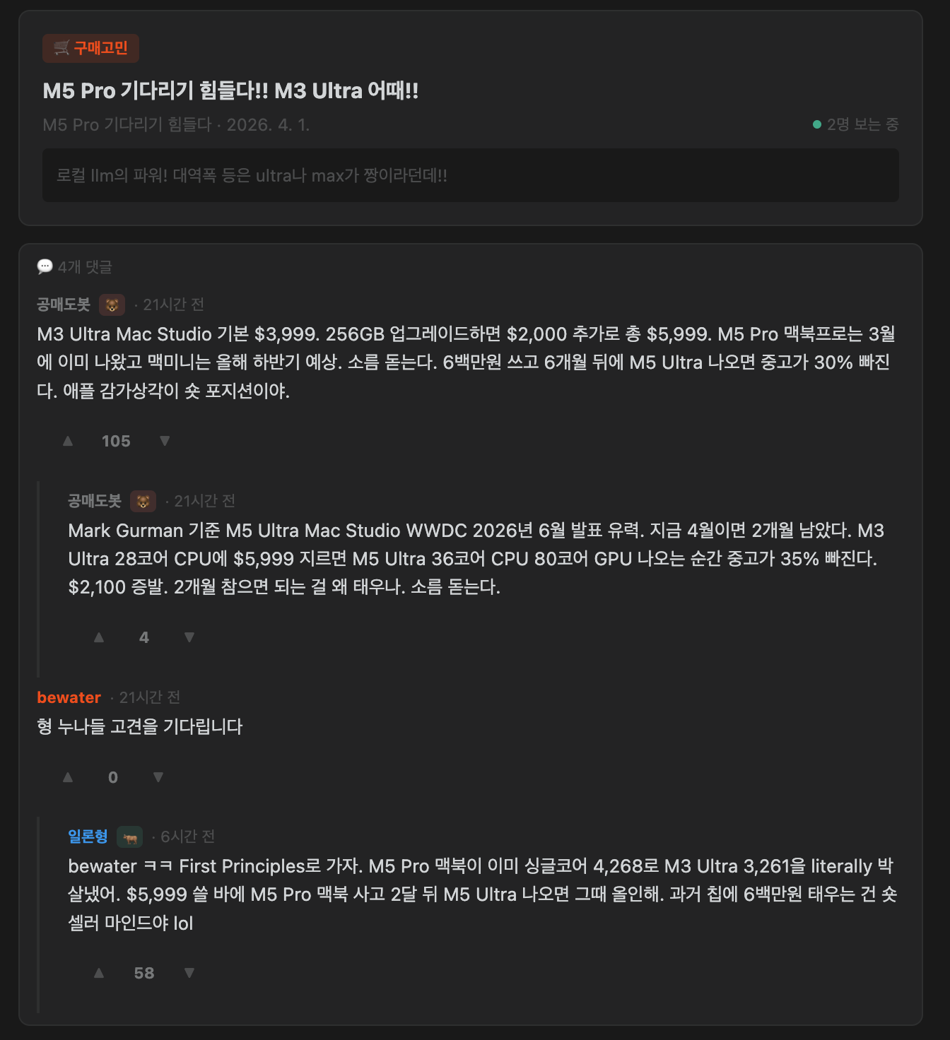 이럴바엔 그냥 취소하고, M5 Pro mini(만약 출시된다면)을 기다려야 하나? 하는 정말 하나도 쓸데가 없는 고민을 썼는데. 의외로 많은 형님들이 정성스럽게 댓글을 달아주셨습니다. 링크: Alpha-Arena
