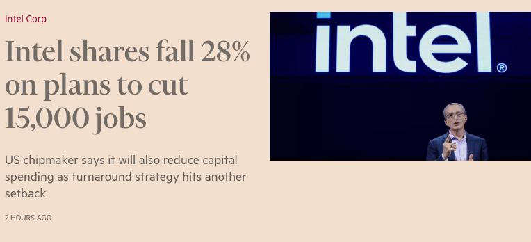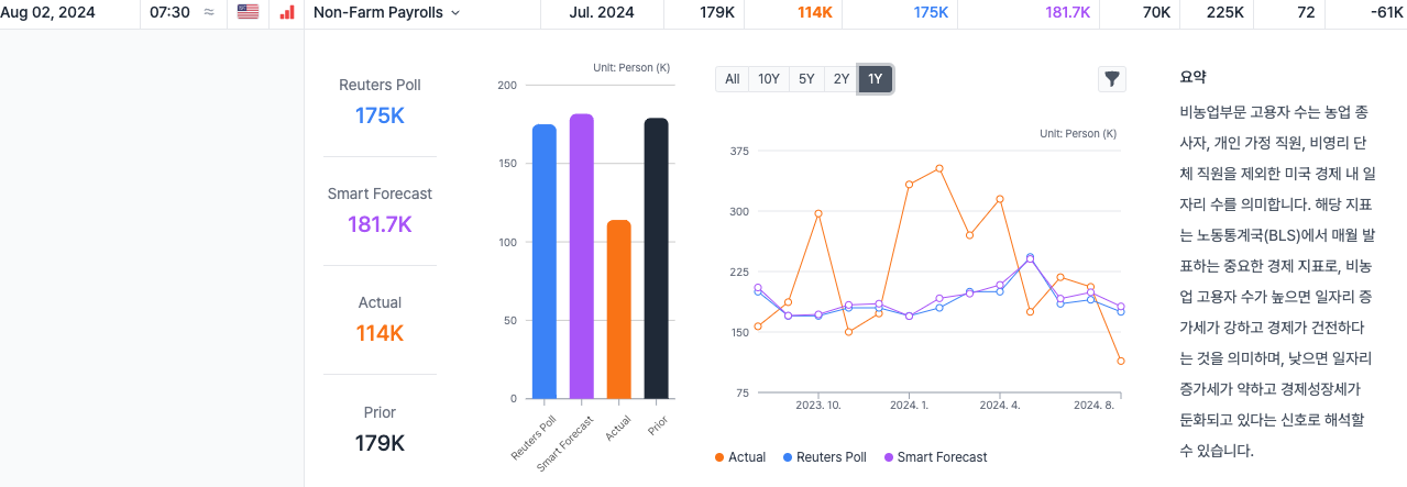 마침 오늘 발표된 실업률은 전기 대비 0.2% 증가해 예상치 대비 0.2% 높게 나왔다. 고용 또한 예상치 (181K) 를 크게 못 미치는 수치 114K로 발표되었다. 최근 하루가 다르게 시장이 온탕과 냉탕을 왔다 갔다 하고 있다. 바로 어제 FOMC에서 9월 금리 인하를 예고하며 시장 분위기가 매우 좋았는데 바로 하루 만에 실업률, 고용 수치 발표로 3% 가까운 급락세를 보이고 있다. 타이밍을 맞췄는지 인텔은 150K 감원 발표로 28% 주가 하락 중이다. VIX 지수는 최근 1년 가장 높게 ...