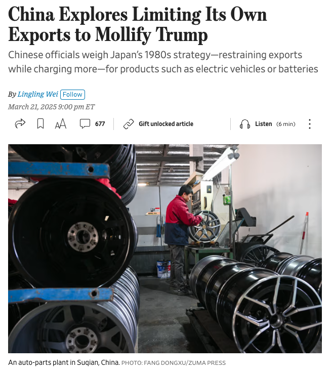 이 기사는 2025년 3월 21일자 월스트리트저널에 실린 것으로, 중국이 트럼프 대통령과의 무역 갈등을 줄이기 위해 새로운 전략을 고민 중이라는 내용을 다룹니다. 쉽게 말하면, 중국은 미국이 추가로 올린 관세(20%)와 경제 압박에 대응하기 위해, 과거 1980년대 일본이 했던 방법을 따라 할까 생각하고 있어요.