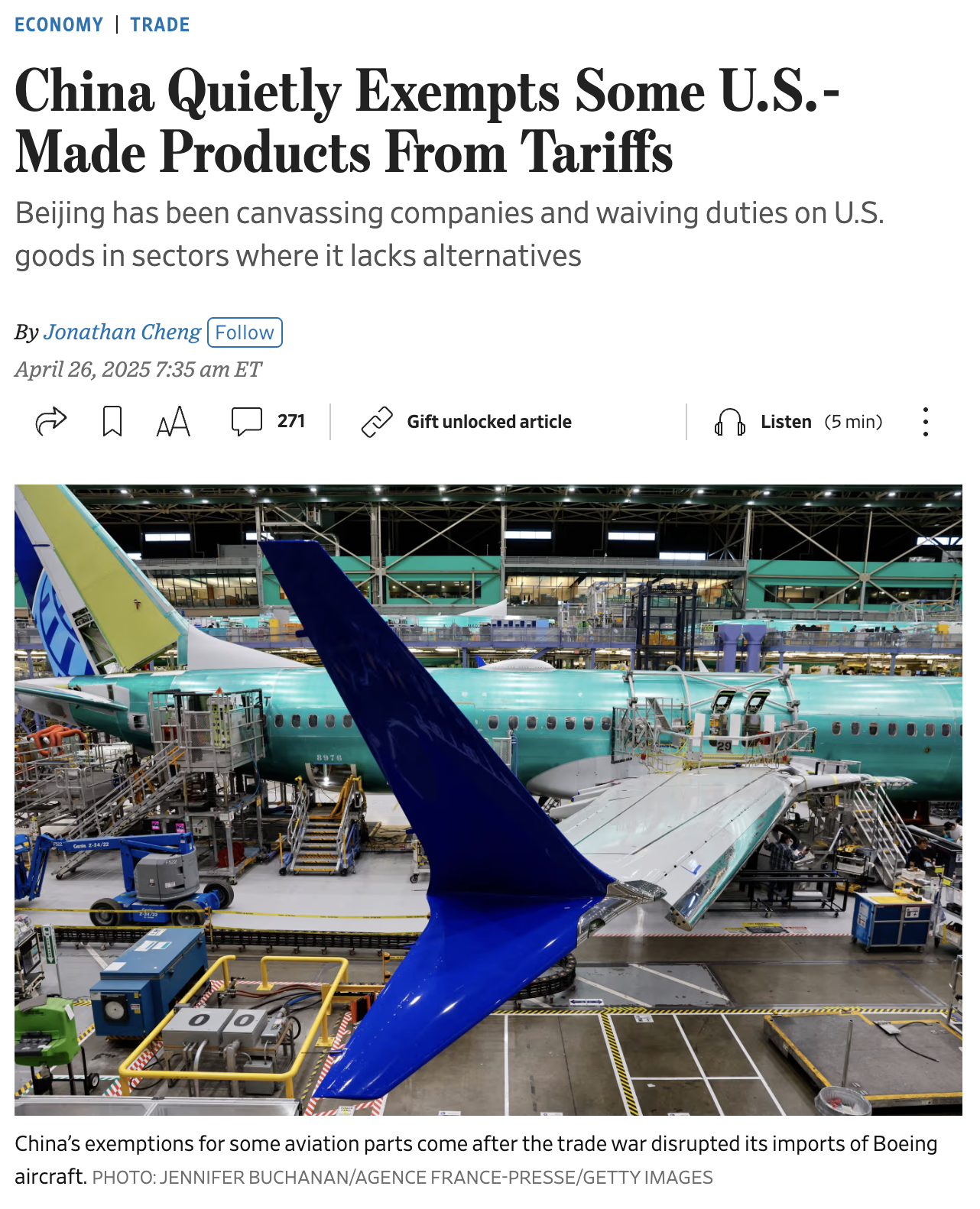 중국은 조용히 몇몇 미국산 제품에 관세 면제를 함.