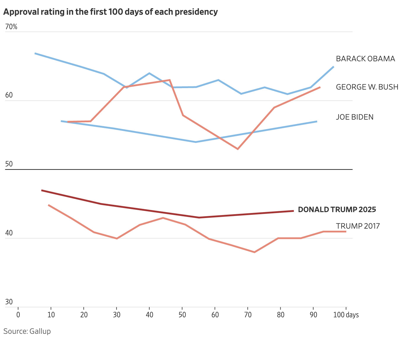 트럼프 지지율은 전 정부보다 한참 낮지만 트럼프 1기 때 보다는 높다.