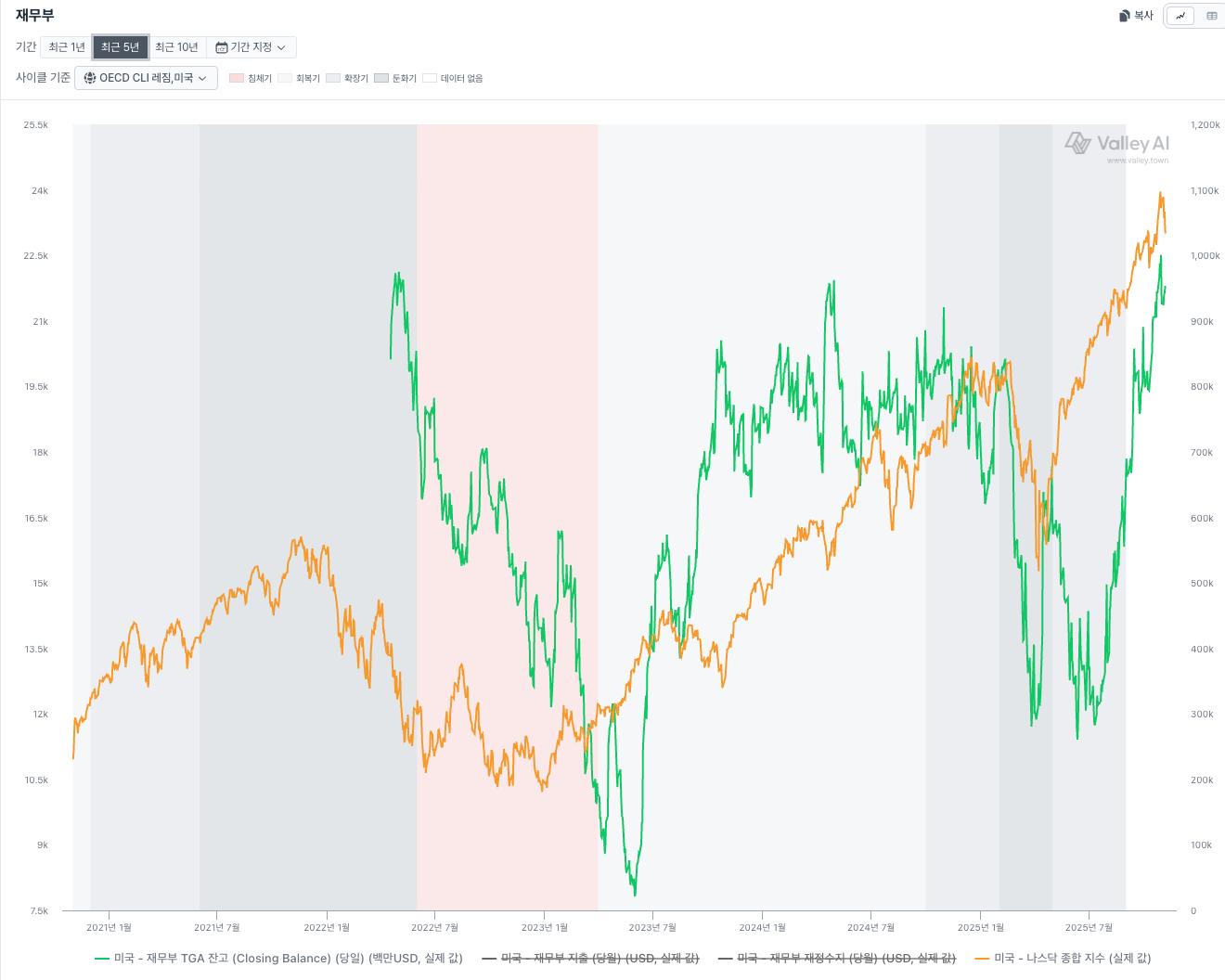 재무부 TGA 잔고를 보니 최근 많이 늘긴했다. 정부 셧다운도 진행되고 있고 지출을 통제하니 재정수지가 단기적으로 많이 올라왔고 동시에 TGA 잔고도 많이 불었다.