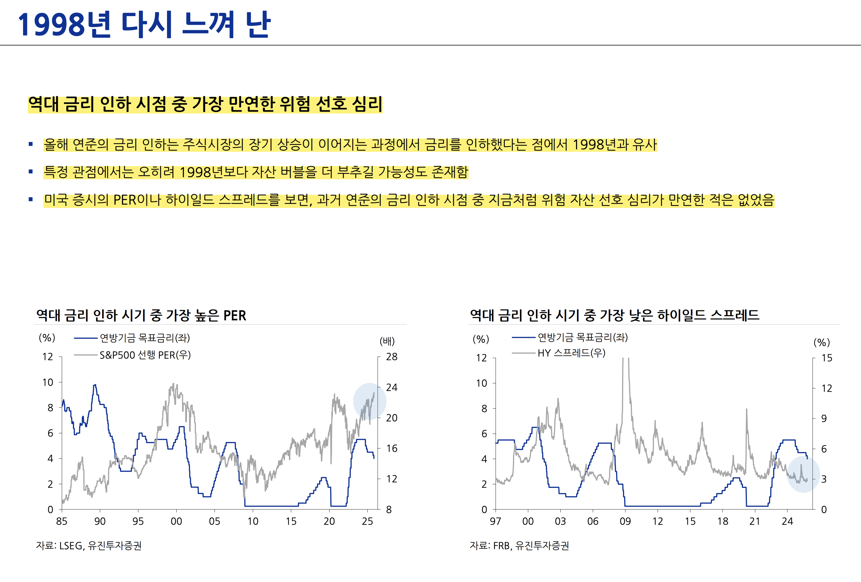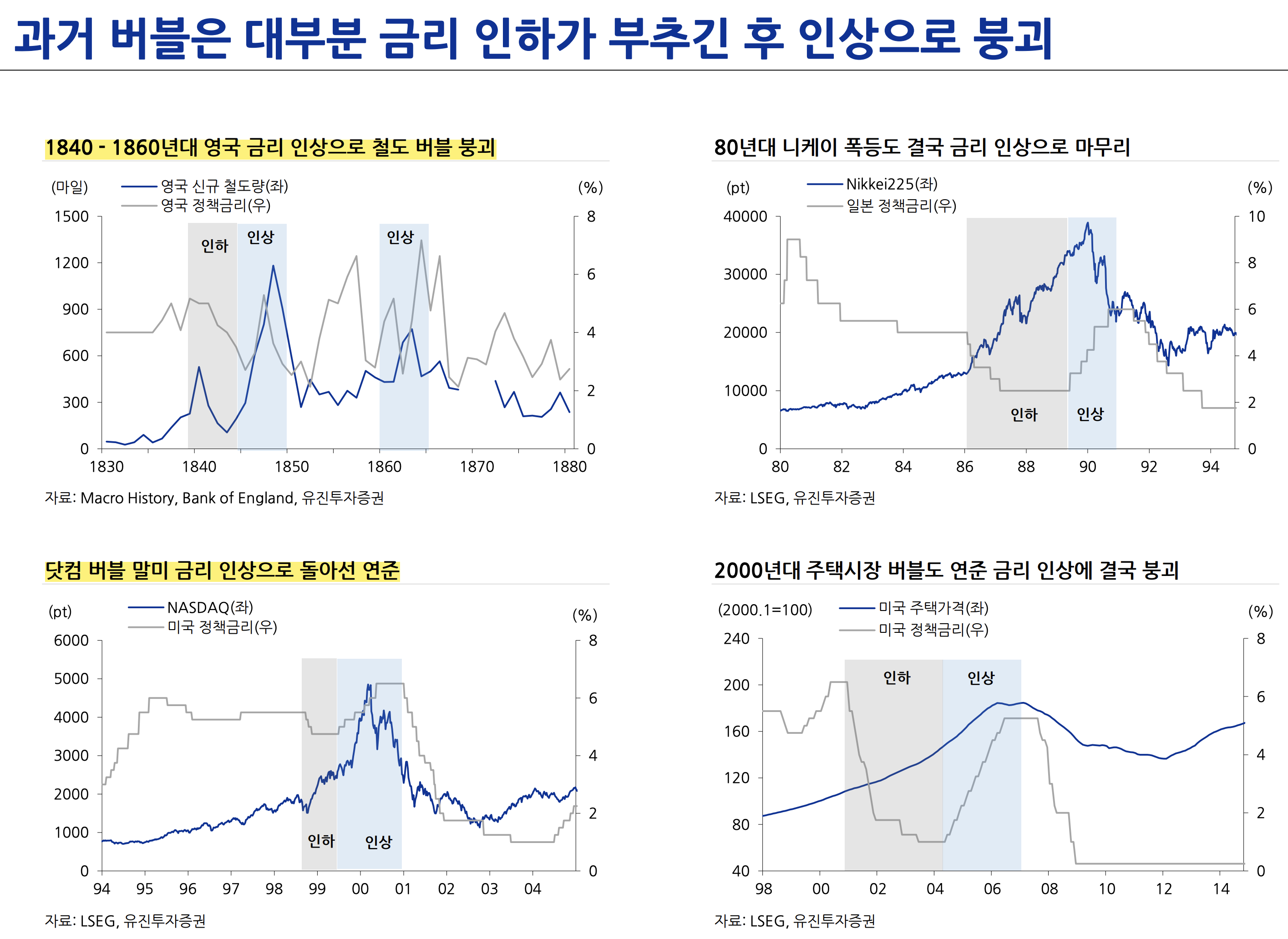 유진투자증권 리포트, 재미있게 읽었다. 과거 대부분 버블이 금리인하로 커진 뒤 금리 인하와 함께 시즌 종료. 과거 사이클의 반복이 맞다면 지금은 완연한 초입 지점. 왠지 젠슨황의 말과 겹치는 듯도 하고.