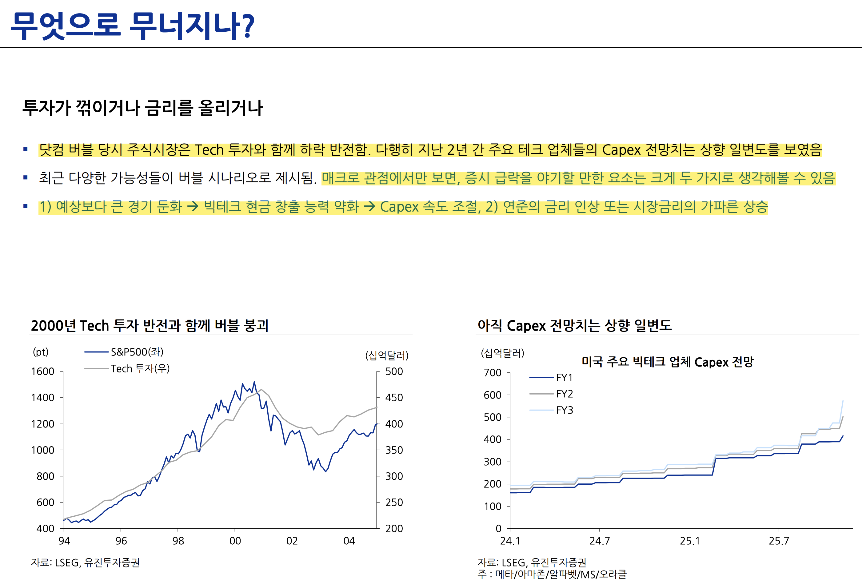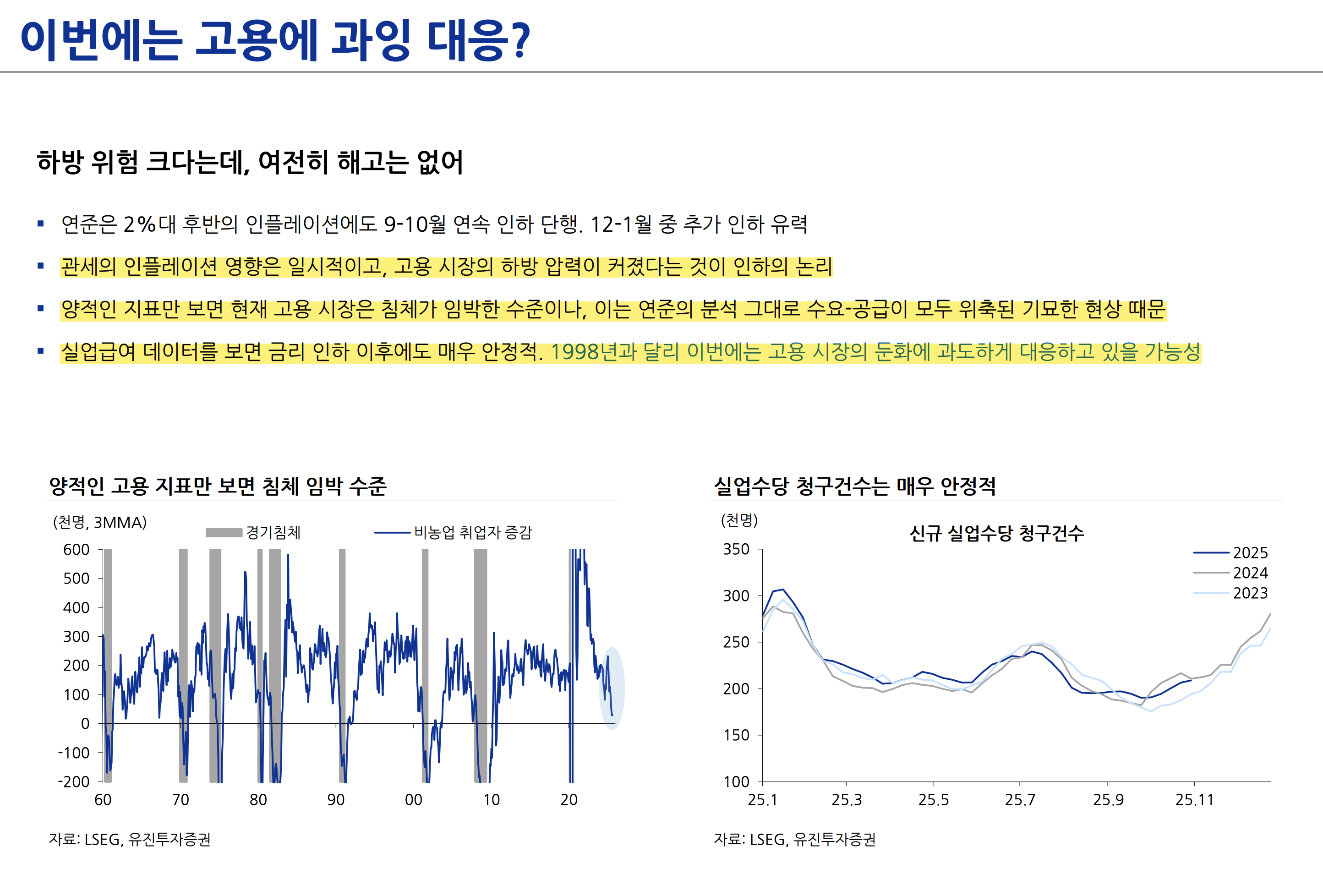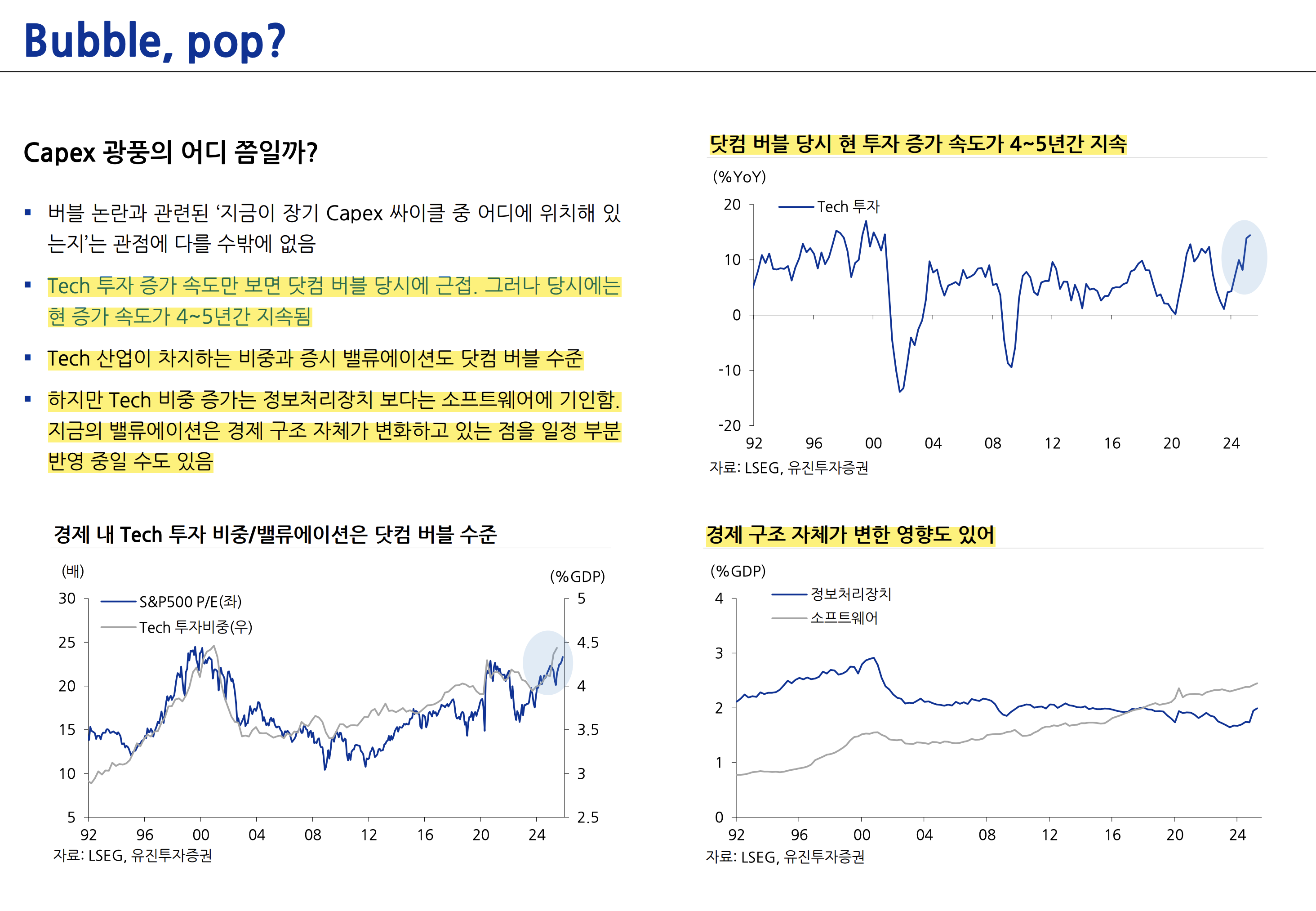 올 해 침체가 온다, 고인플레가 온다 말이 많았는데 결국은 아무것도 오지 않았음. AI 투자 때문인데, 이게 없었으면 이미 침체에 빠졌을 수도. 시장은 생물과 같아서 어떤 네러티브로 진화해갈지는 아무도 알 수 없는 듯. 과거의 길을 반복할 수도 있고 새로운 변형이 탄생할수도 있고. 섣부른 판단과 편향을 갖지 않고 모니터링 해가는 게 중요.