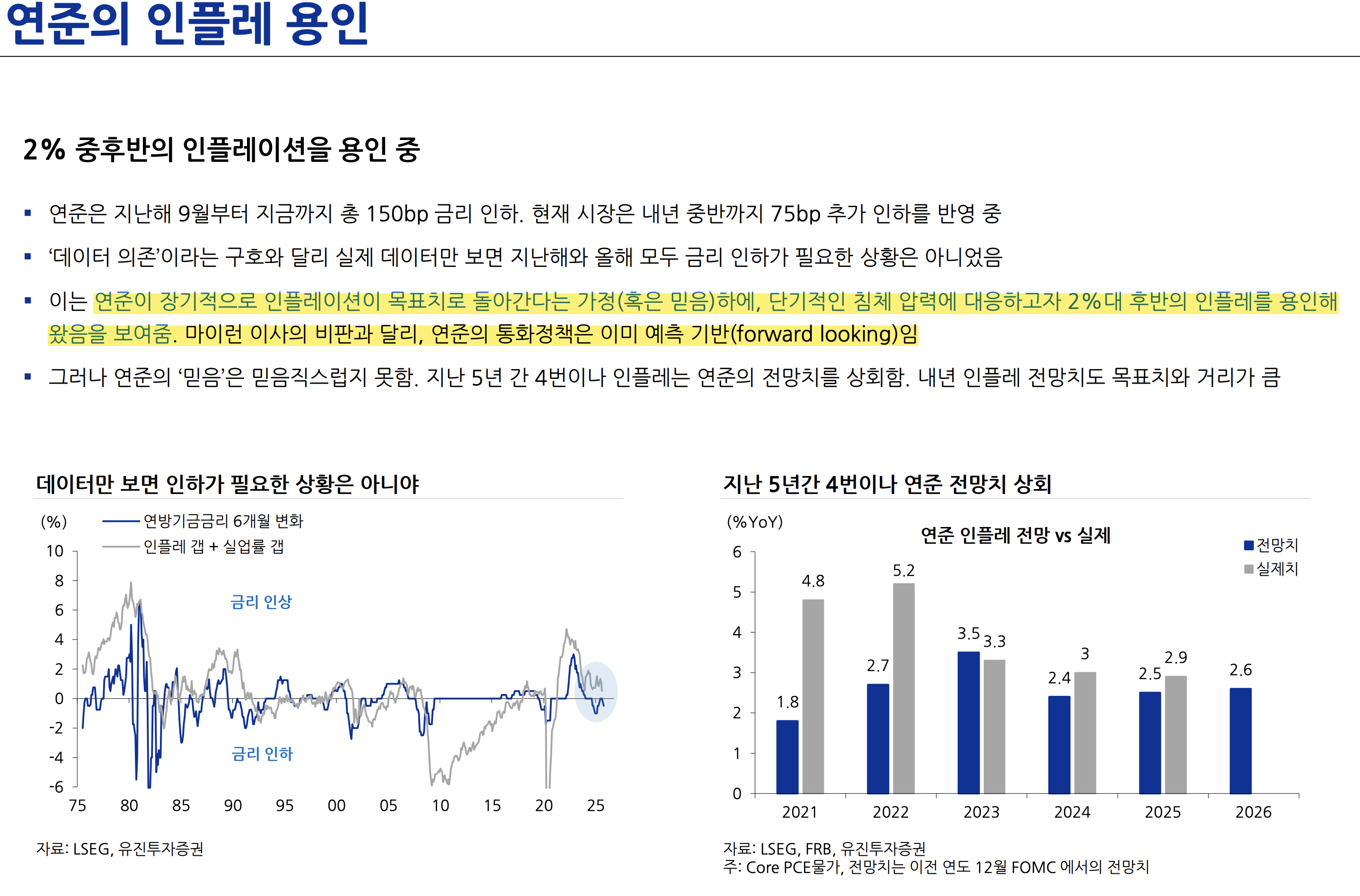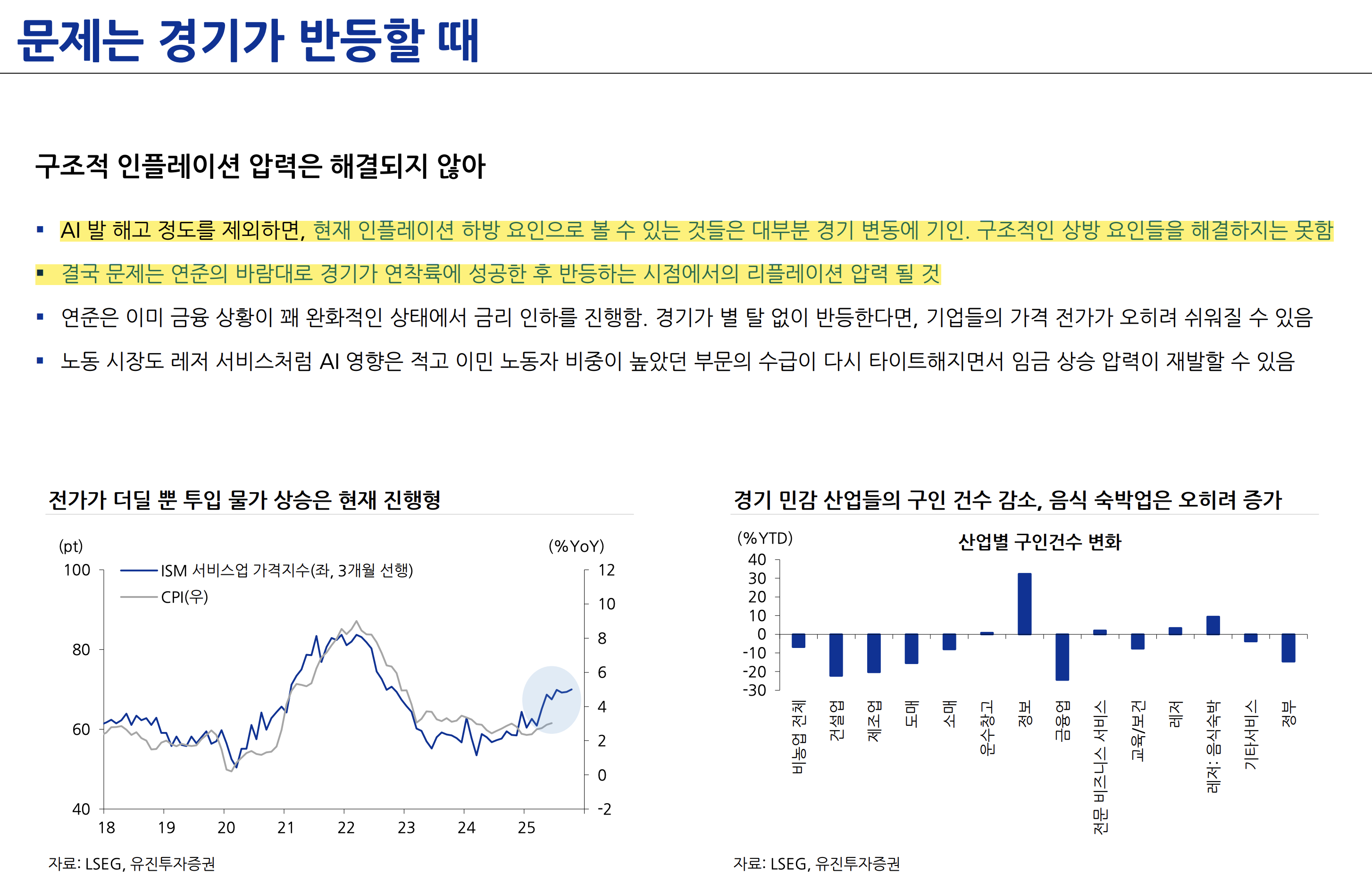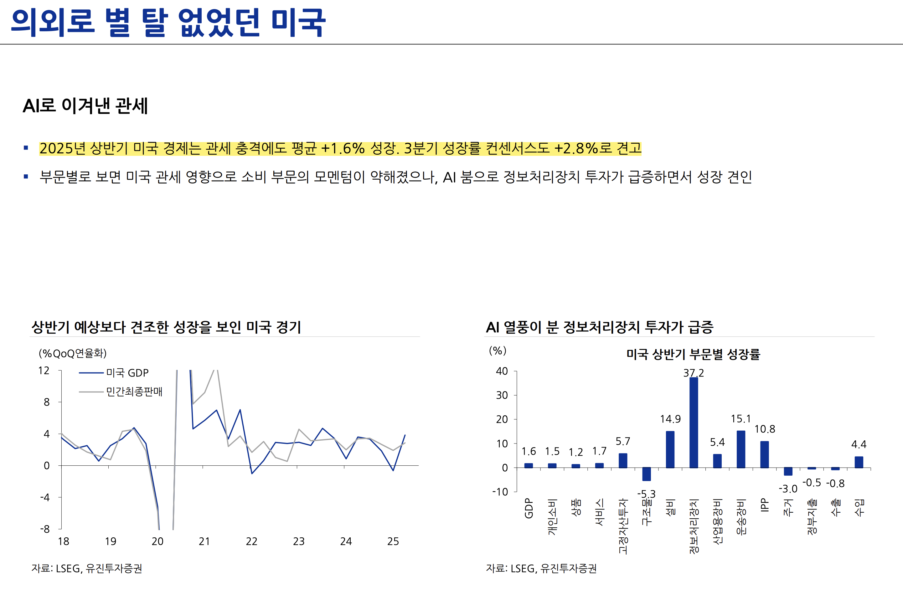 올 해 침체가 온다, 고인플레가 온다 말이 많았는데 결국은 아무것도 오지 않았음. AI 투자 때문인데, 이게 없었으면 이미 침체에 빠졌을 수도. 시장은 생물과 같아서 어떤 네러티브로 진화해갈지는 아무도 알 수 없는 듯. 과거의 길을 반복할 수도 있고 새로운 변형이 탄생할수도 있고. 섣부른 판단과 편향을 갖지 않고 모니터링 해가는 게 중요.
