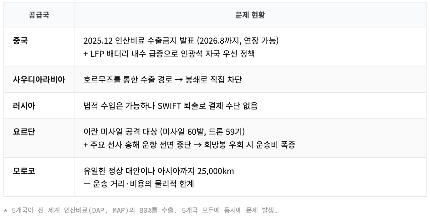 칼륨: 캐나다·러시아·벨라루스에서 생산되어 직접 충격은 상대적으로 적다. 그러나 칼륨은 식물 성장 보조 역할이라 타이밍에 덜 민감하다. 문제는 파종 직전 대량 투입이 필요한 질소와 인산이 동시에 막혔다는 것이다.