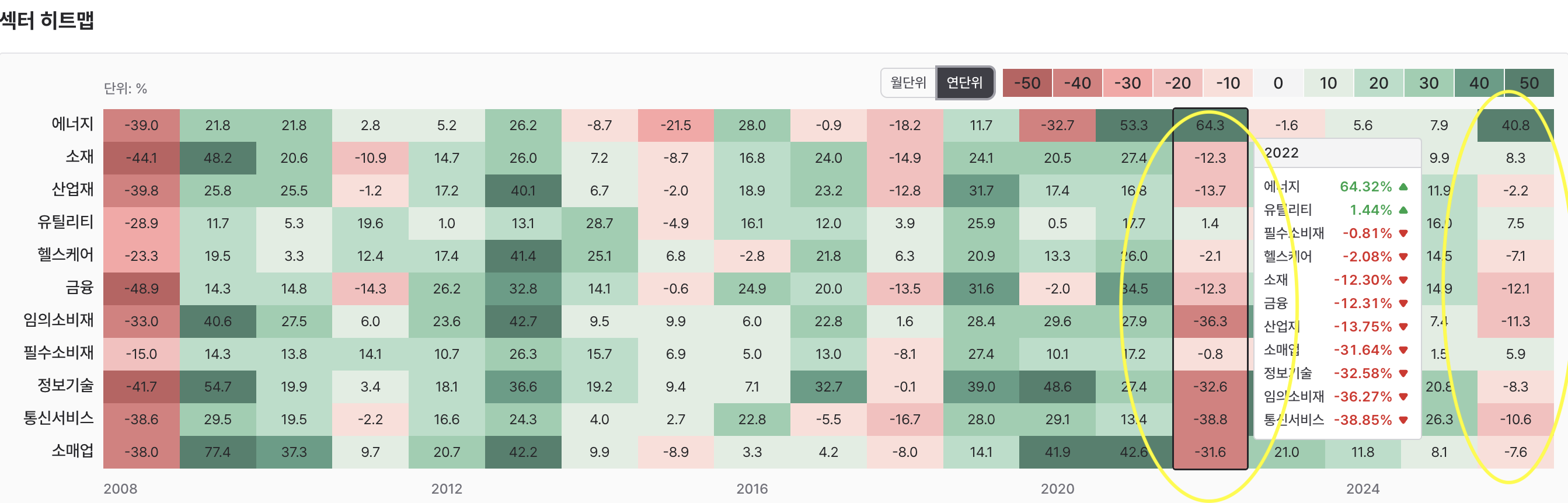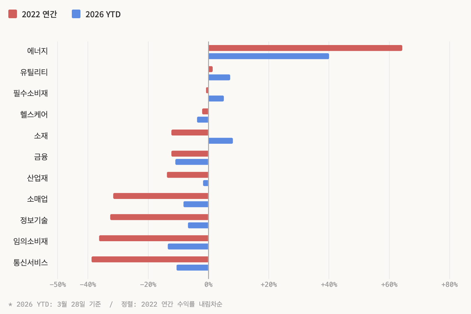 벨리 연간 섹터 히트맵을 보는데 2022년과 26년 YTD 운율이 잘 맞는 게 눈에 들어왔습니다.