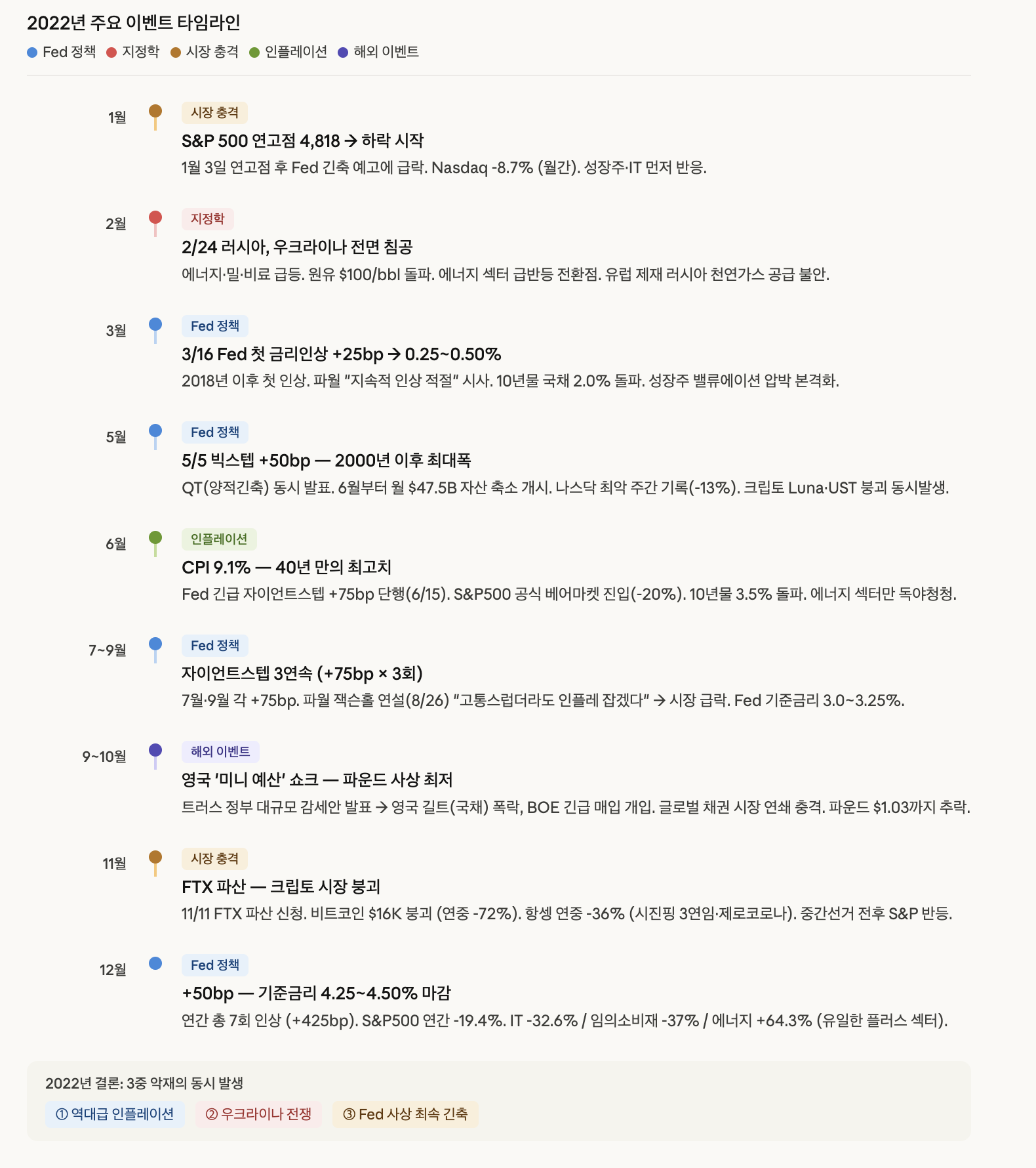 2022년도에 무슨 일이 있었지? 잘 생각이 안 난다. 클로드에게 물어보자.. 내용을 들여다 보니 두 해를 나란히 놓고 몇 개의 렌즈 (전쟁, 원유·원자재, 인플레이션, 정치, 연준 )로 비교해보고 싶어졌습니다.