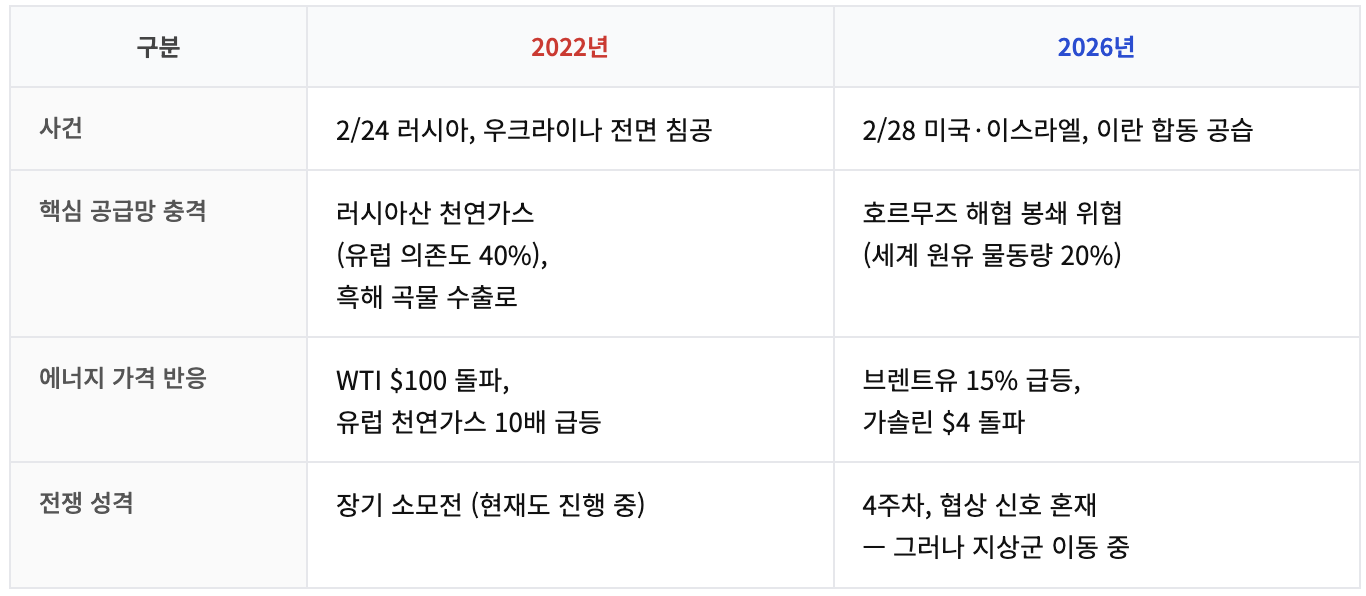차이점: 2022년 우크라이나 전쟁은 인플레이션의 원인이 아니었다. CPI는 전쟁 전인 2022년 1월에 이미 7.5%였다. 전쟁은 이미 달아오른 불에 기름을 부은 가속 요인이었다. 2026년 이란 전쟁은 상대적으로 안정돼 있던 환경(전쟁 전 CPI 2.4%)에 직접적인 에너지·원자재 충격을 가했다. 원인의 순서가 반대다.