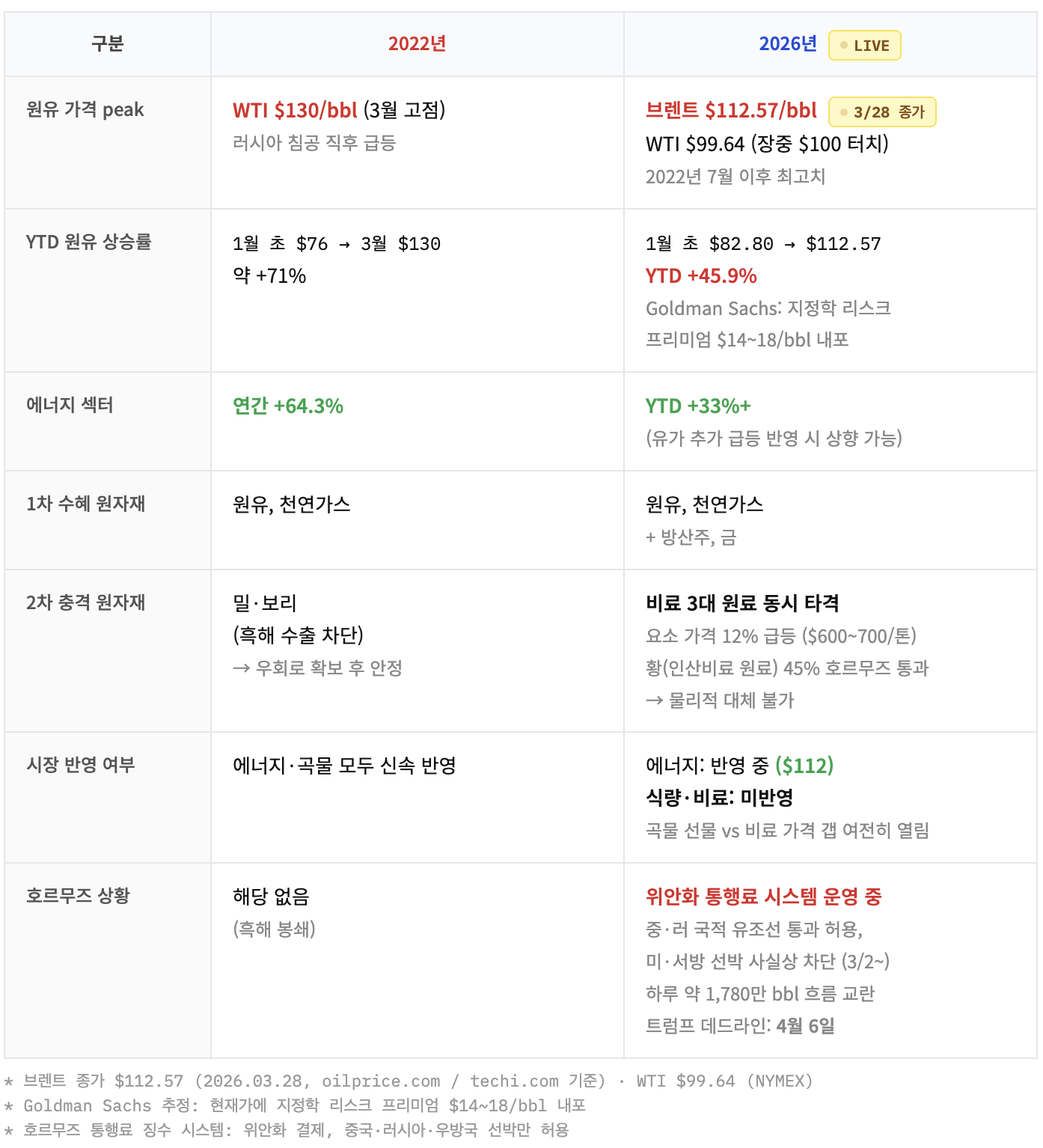 공통점: 둘 다 시장이 사전에 가격에 반영하지 못한 외생적 공급 충격이다. 에너지 섹터를 순식간에 유일한 수혜 섹터로 만들었다는 것도 같다.