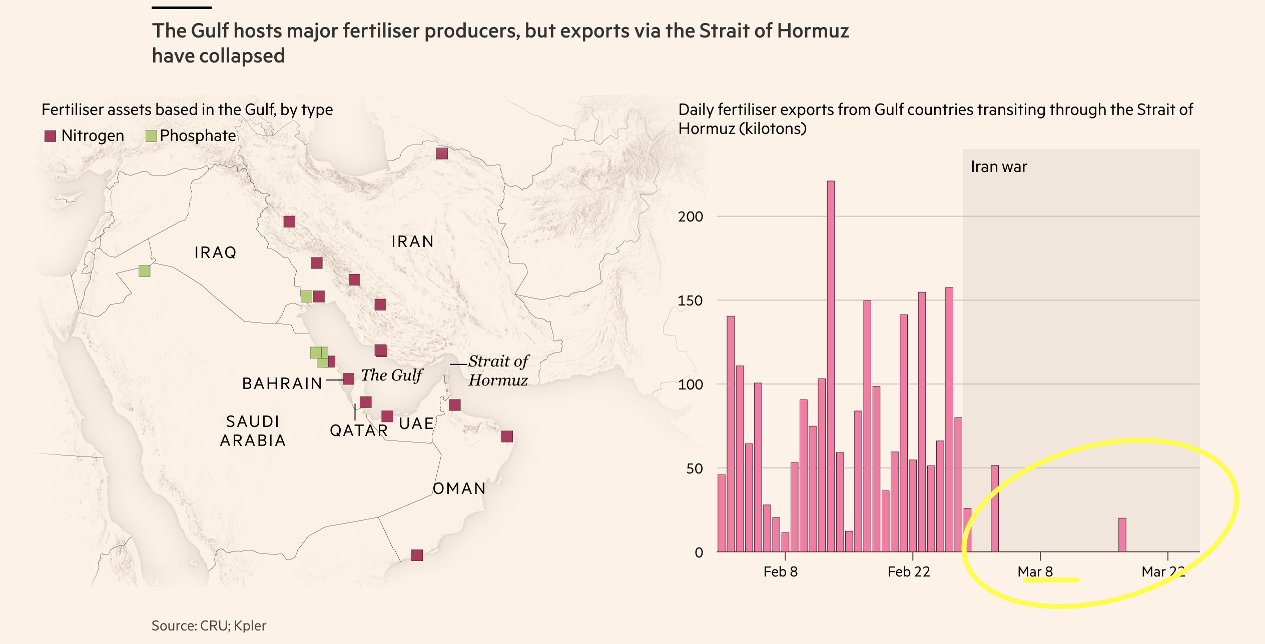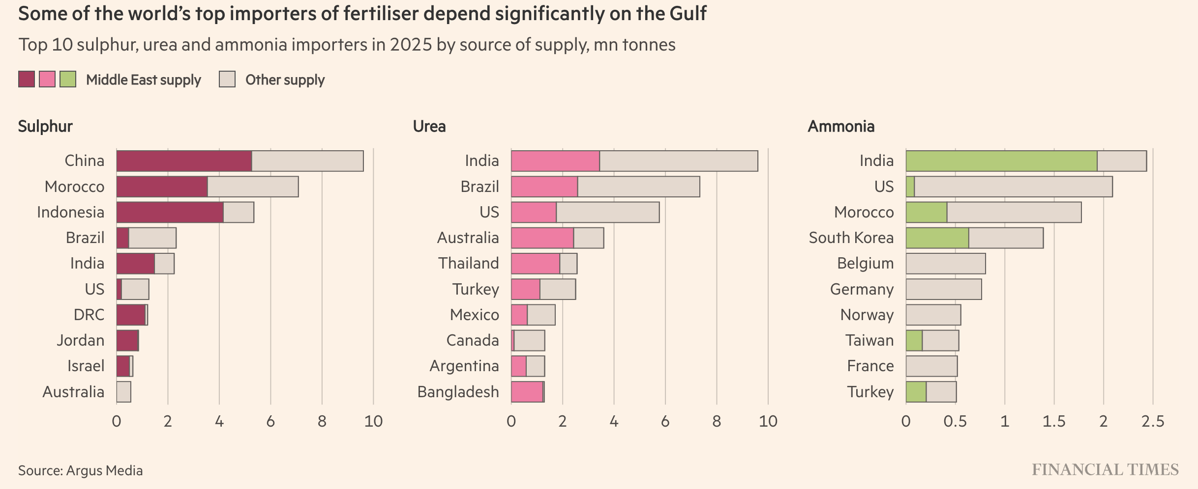 비료는 다르다. 질소는 천연가스 없이 만들 수 없고, 인산은 황 없이 만들 수 없다. FT 기사에 CRU의 크리스 로슨이 이 차이를 한마디로 정리했다. "In 2022 it was about sanctions and logistics — solutions were found. This time it is just pure physical limitation." 대체재가 없다.