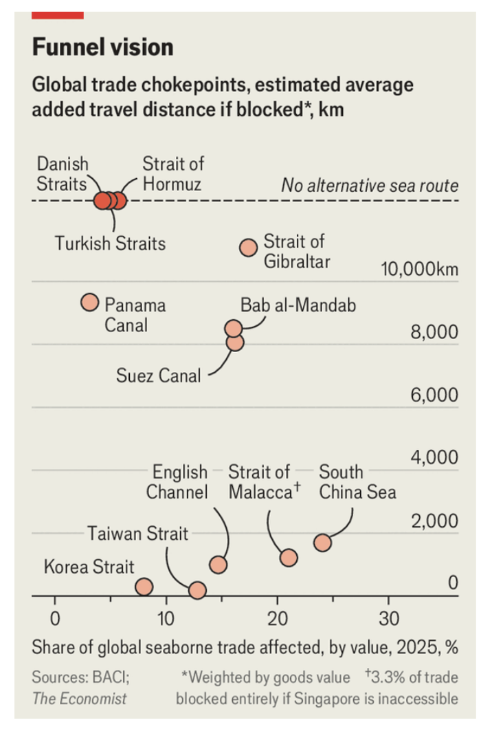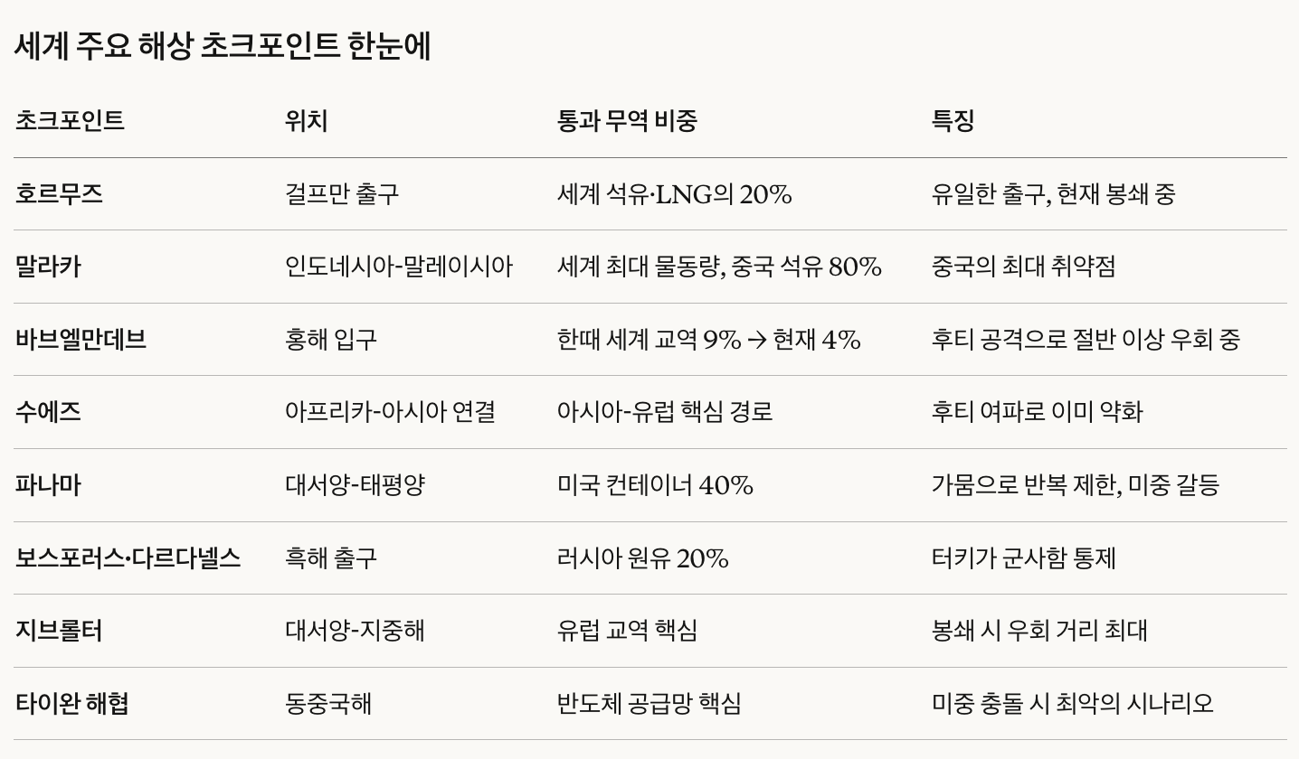 2022년이 흑해라는 단일 초크포인트의 충격이었다면, 2026년은 다르다. 이코노미스트 지의 분석에 따르면 세계 8대 해상 초크포인트가 동시에 압박받고 있다. 바브엘만데브는 후티 공격으로 이미 물동량이 반토막(9%→4%)났고, 파나마는 가뭄으로 반복 제한 중이다. 호르무즈는 그 압박의 가장 최근 발현일 뿐이다.