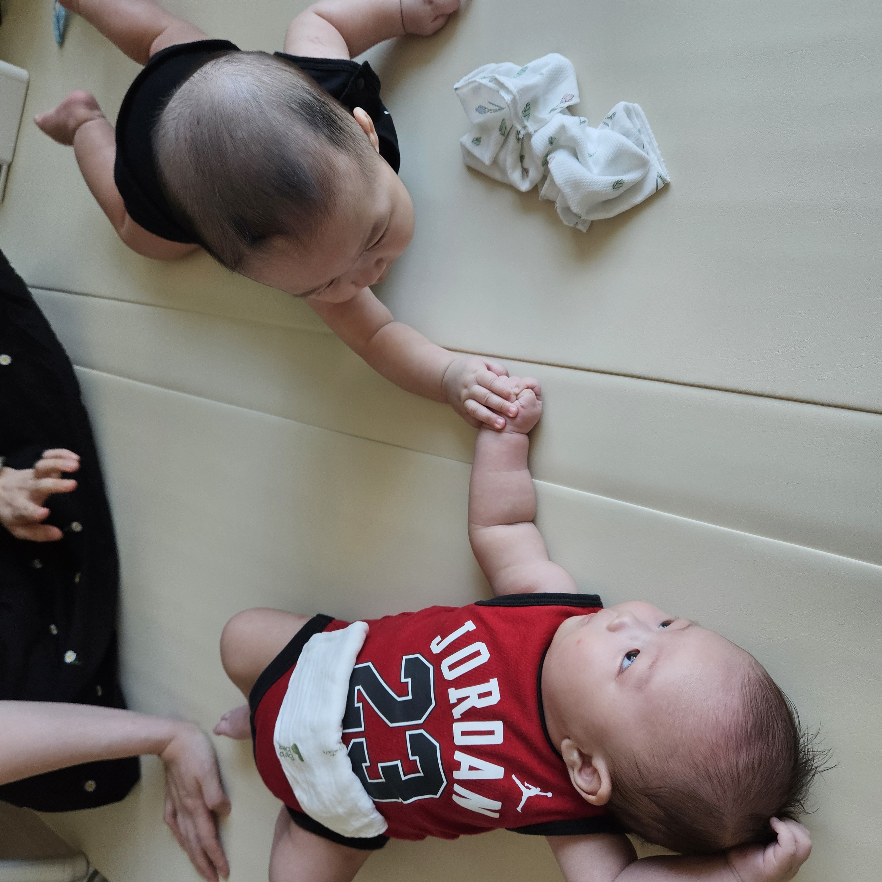 딴딴이 인생 처음으로 친구를 만났다. 같은 회사 동료의 아들 김쿵짝! 딴딴이와 이름이 비슷해서 태어나기 전부터 쿵짝 딴딴 거리면서 만나길 학수고대했다. 쿵짝이가 4달 먼저 태어나서 크기는 훨씬 크지만 24년에 태어난 용띠 친구다. 나도 대략 50일 만에 쿵짝이를 다시 만났는데 엄청나게 급성장해서 돌아왔다. 우리 아이가 무럭무럭 자라는 중인줄 알았는데 쿵짝이를 보니...아 아직 딴딴이는 작은 아이구나 싶었다. 분명 쿵짝이도 쪼그만 했을 때가 있었는데 급성장한 모습을 보니 지금 우리 아이의 모습을 더 소중히 다뤄줘야겠다고 느꼈다. 이 작고 귀여운 모습이 이제 50일 정도 지나면 없어진다니 ㅠㅠ 아쉽다.