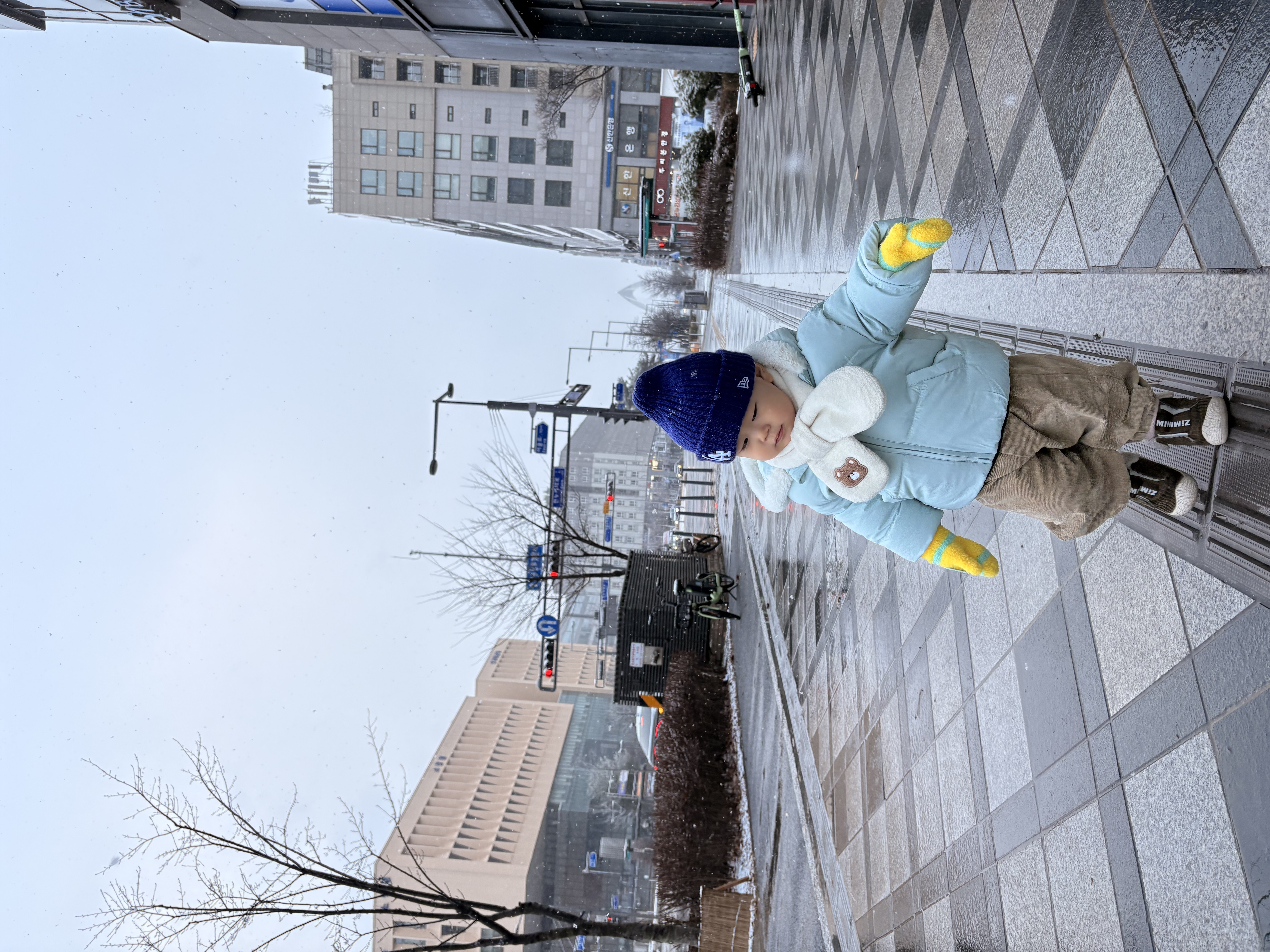 아이도 마음이 편안해졌는지 이상하게 아빠 무릎에 포근하게 누워있는다. 그 모습이 너무 귀여워서 시간 가는 줄 모르고 지켜본다. 그렇게 10분 이상 누워있더니 갑자기 기분이 좋아졌는지 웃기 시작한다. 장난감을 흔들어보고 뒹굴거린다. 펑펑 내리는 눈을 보고 있으니 아이에게 눈을 보여주고 싶다. 그렇게 눈길을 걷기 위해 나갈 결심을 했다. 목표는 함박눈을 바라보며 버스 정류장까지 가는 것이다. 18개월 남아의 최대 즐거움은 '버스'다. 엄마, 아빠 다음으로 많이 말하는 단어.