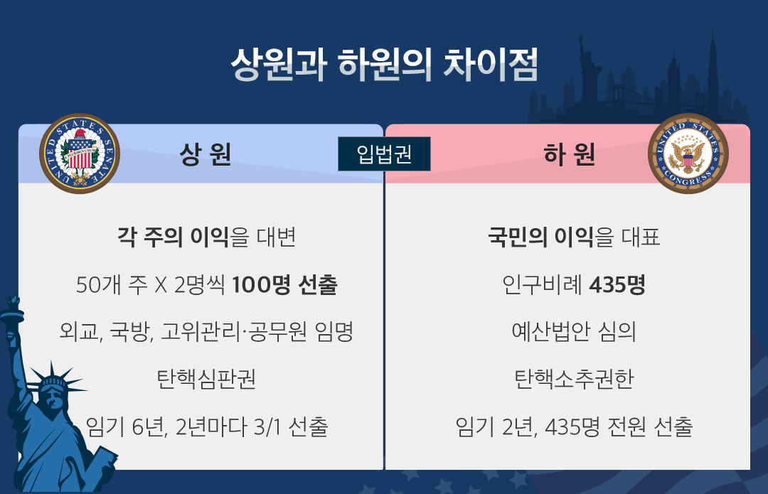 본격적인 판세 분석에 들어가기 전에, 미국 의회의 구조를 먼저 이해해야 합니다. 미국 의회는 하원(House of Representatives)과 상원(Senate)으로 나뉘어 있습니다. 이 두 기관은 같은 건물(미국 국회의사당)을 나눠 쓰고 있지만, 사실 성격이 전혀 다른 두 개의 정치 장치입니다. 한국으로 치면 단원제 국회 하나만 있는데, 미국은 두 개의 국회가 서로 견제하면서 작동하는 구조입니다.