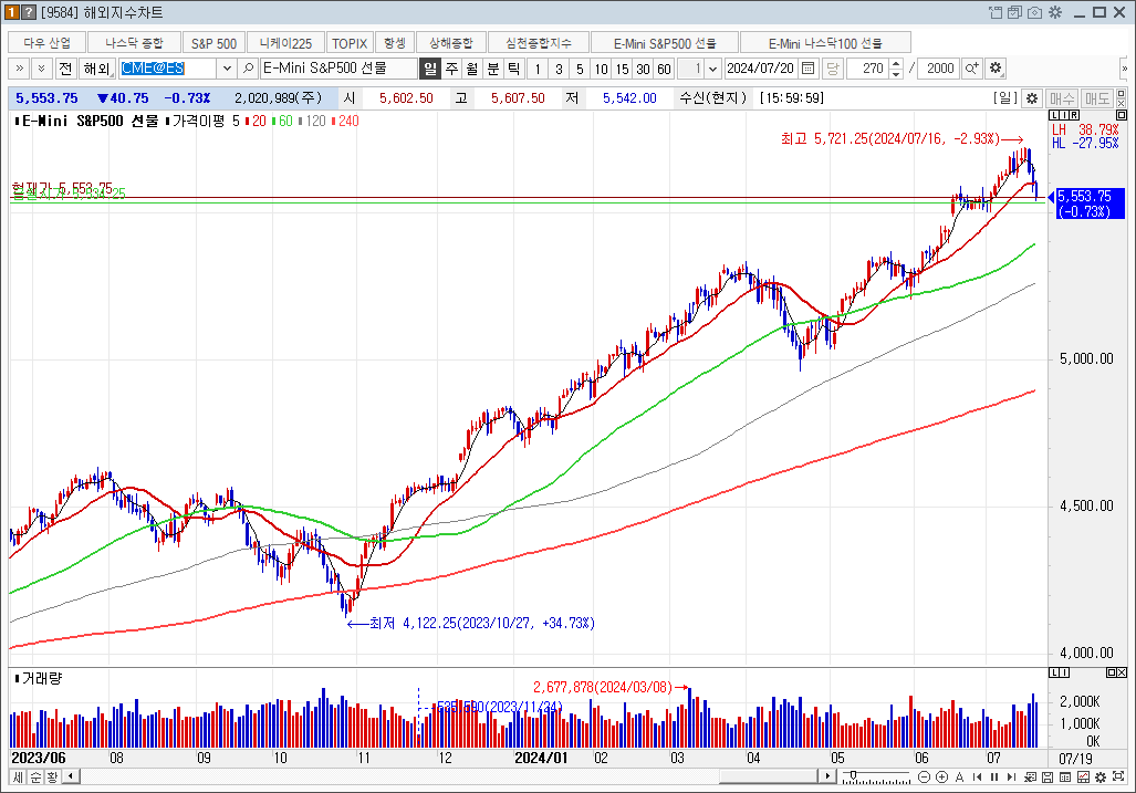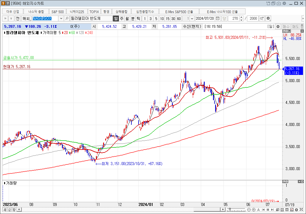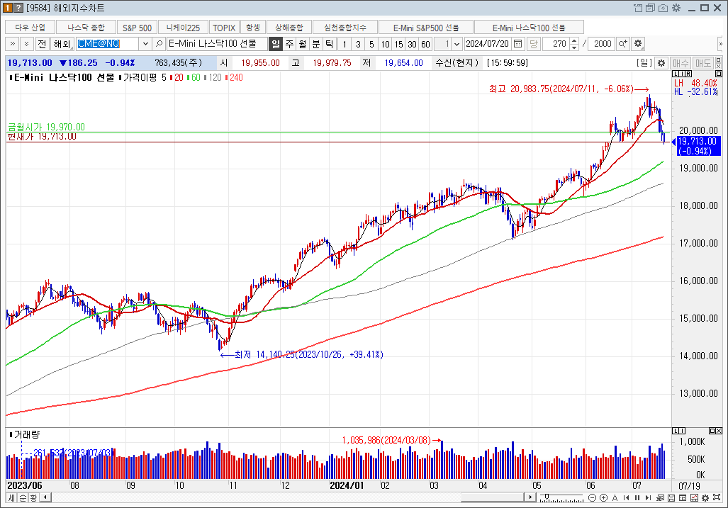 슨피500과 비슷한 느낌이지만 20일선 아래로 내려온 길이는 좀 더 깊은 조정이다.