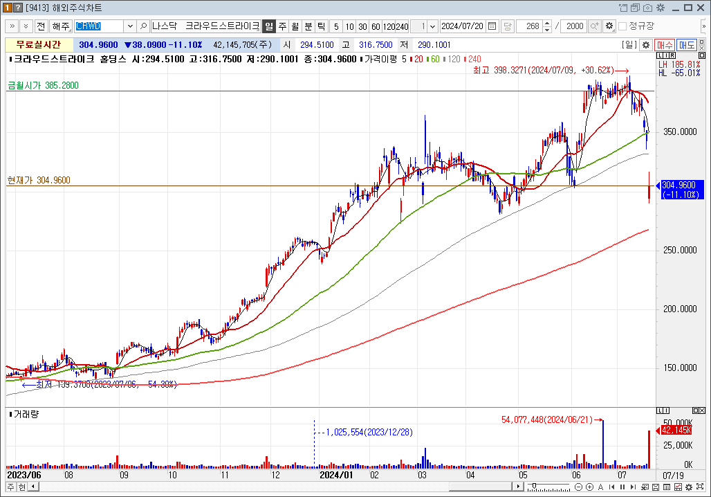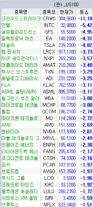 크라우드스트라이크 -11%에서부터 넷플릭스 -1.5%까지 꽤 진중하게 빠졌다.