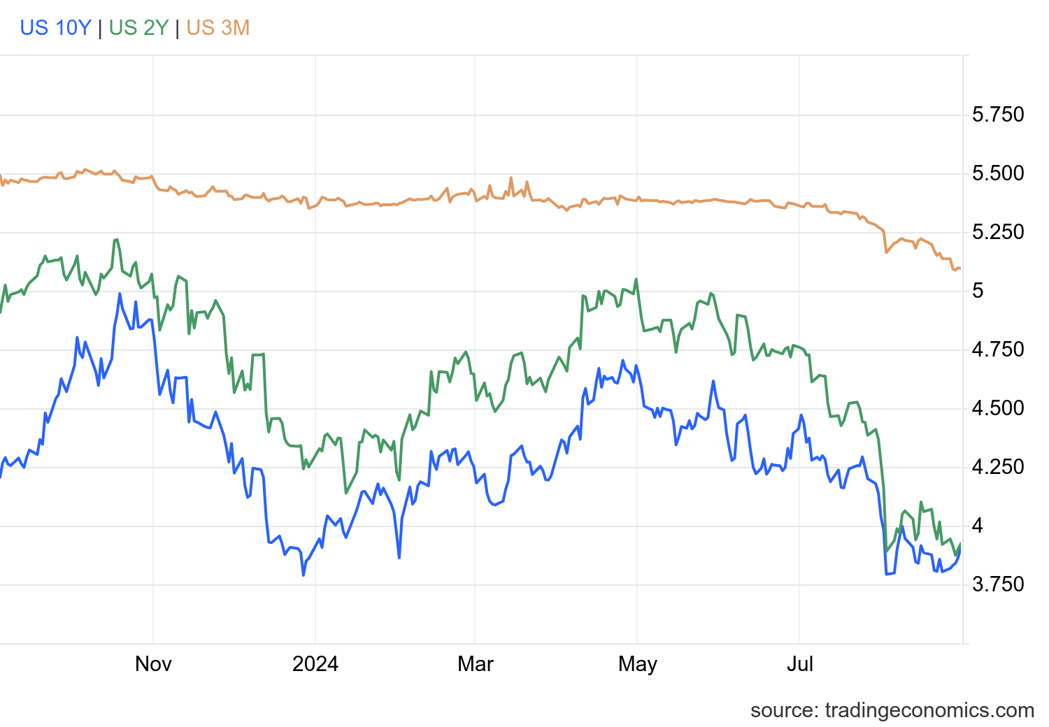미국채 3개월, 2년 10년물 수익률