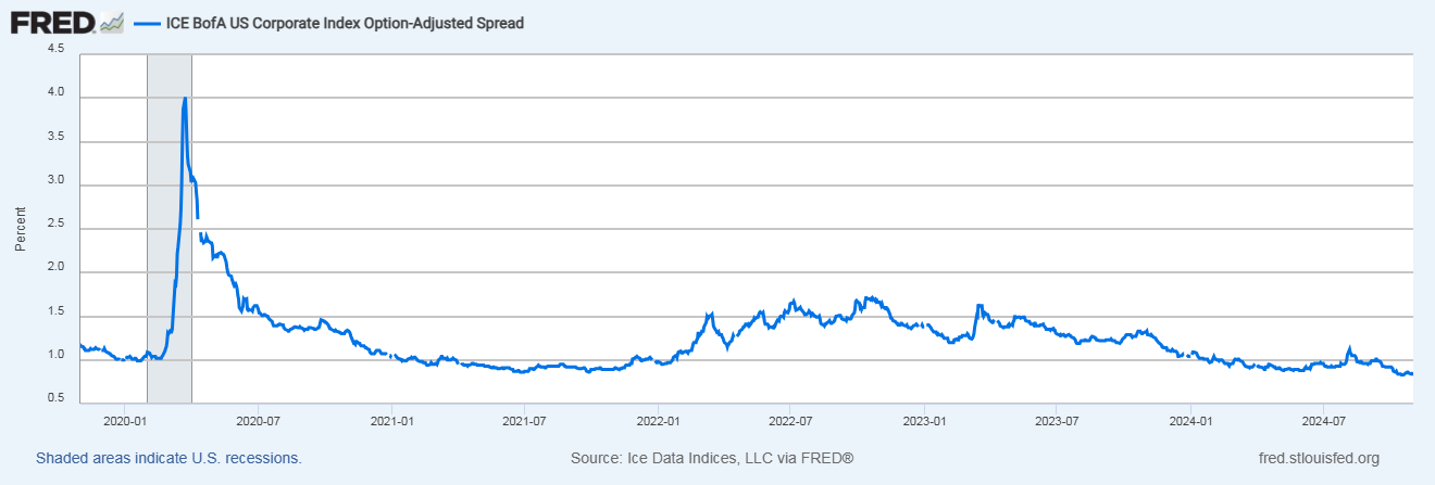 일단 국채대비 회사채의 credit premium이 이만큼 격차를 줄였다는 건 회사의 부도 위험이 적다고 보는 것이겠다.