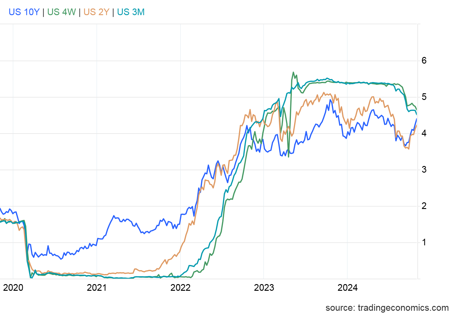 미국채 10년(장기), 2년(중기), 3개월, 4주물(단기) 금리