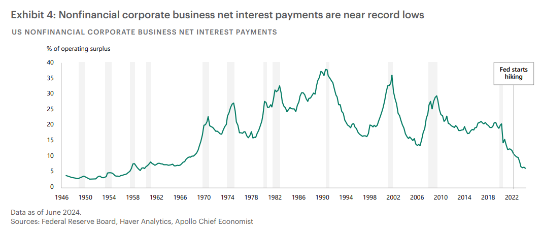 투자등급(IG) 사채(아래 녹색 굵고 짙은 선)의 발행규모는 계속 (드라마틱하게) 증가했으며, 금리 인상기 전에 발행한 총량이 대단했다는 것을 의미한다. 물론 금리 인상기에 미국채 금리(아래 파란색 선 그래프)도 상승해서 현재 4.5%를 넘나들고 있긴 하지만 10년물이라는 가정하에 10년 동안 발행당시 금리로 돈을 빌린 것이니 아직 문제가 생길만한 단계가 아니라는 것은 어느정도 합리성이 있다. 그리고 이어서 순이자지급에 관한 다음 표도 보자.