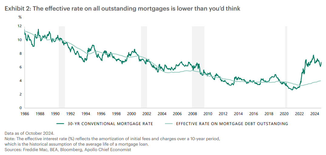 모기지 대출을 현재 안고 있는 차주의 유효 금리(얇고 흐린 곡선)는 사실 바닥에서 별로 높아지지 않았다.