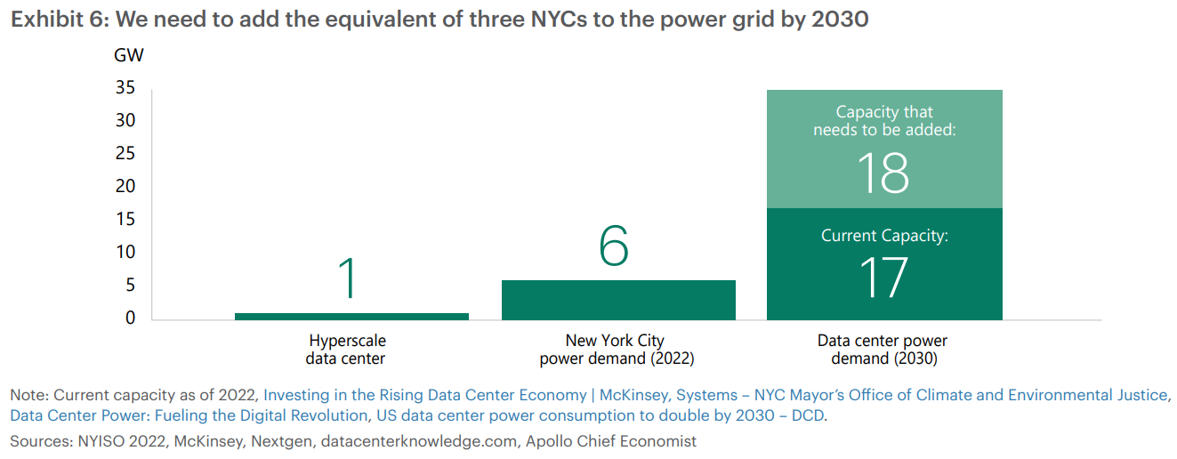 데이터센터 전력 수요가 2022년 현재 17GW인데, 2030년까지 뉴욕시티 전력수요(6GW)의 세배(18GW)에 달하는 추가 전력이 필요하단다.