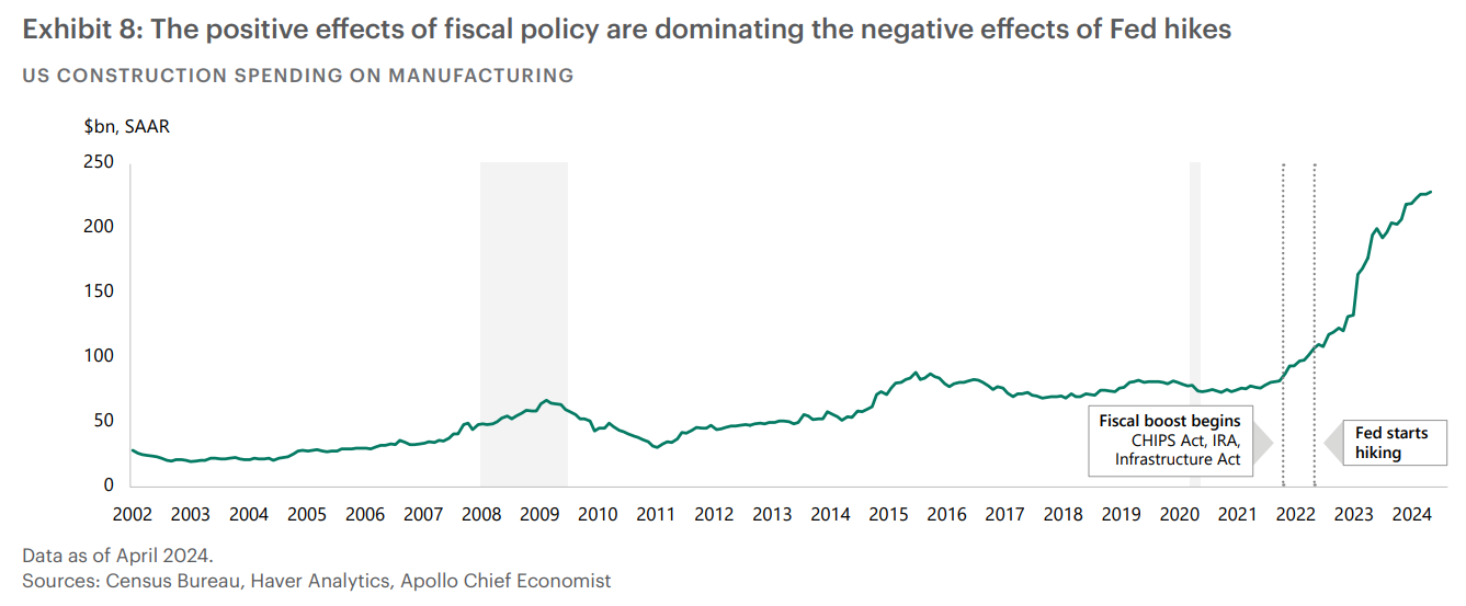 확장적인 재정 정책: CHIPS법, 인플레이션 감축법, 인프라법 등 확장적인 재정 정책이 미국 경제에 긍정적인 영향을 미치고 있다. 이러한 정책들은 제조업 관련 건설 지출의 급증을 이끌어내며 산업 르네상스를 촉진하고 있다.